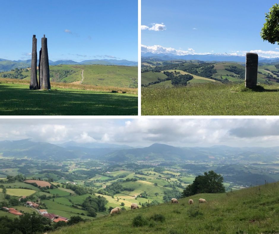 Vendredi 7 juin : « Statues d’Éric Lapie symbolisant la rencontre des 3 chemins au dessus de St Palais … et partout la montagne ! Les pieds vont mieux grâce aux nouvelles sandales de marche, les vieilles doivent déjà être rentrées à La Sauvetat … ».