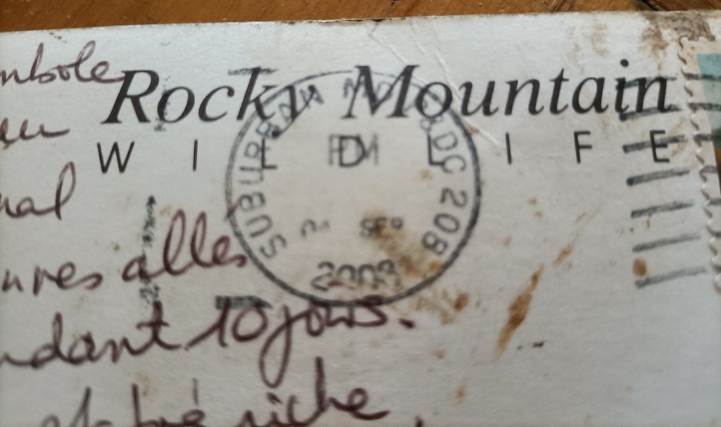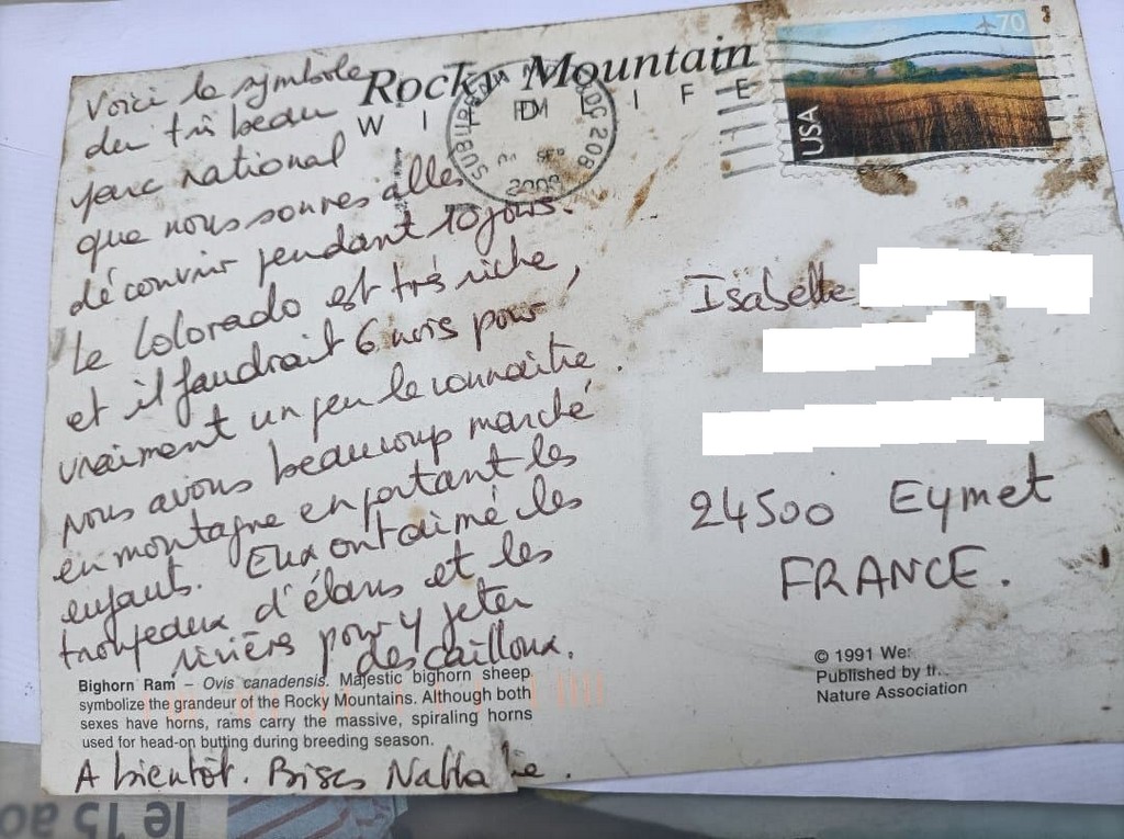 Sur la carte, Nathalie parle d’un beau parc national visité en famille en portant les enfants sur le dos puisque trop jeunes pour randonner toute la journée. Il se trouve que les enfants ont actuellement 21 et 18 ans ! Isabelle et son mari ne comprennent pas et finissent par regarder de plus près le cachet de La Poste. Il est daté de 2003 !!!