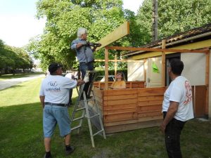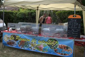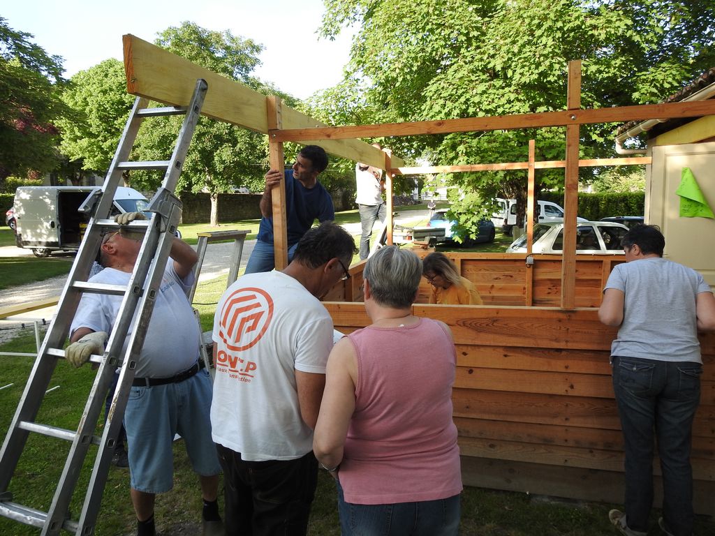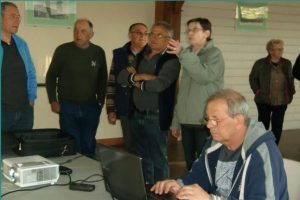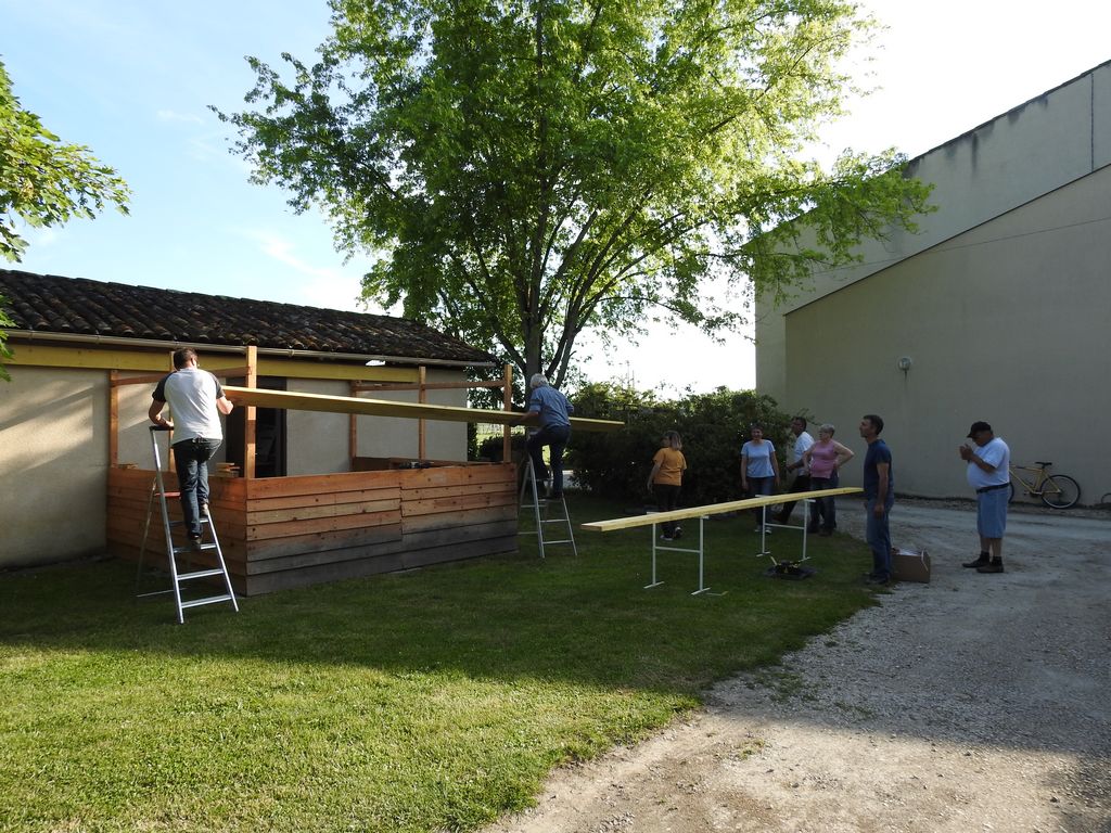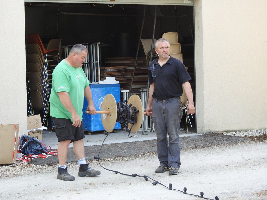 salle de LA SAUVETAT. Pendant que certains préparent les victuailles, GERMAIN installe le matériel