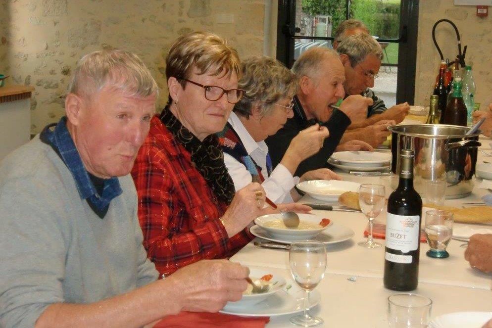 Déjà 18 heures, nous repartons vers LA SAUVETAT en covoiturage où la journée est loin d’être terminée. Jean-Luc Gardeau, Maire de La Sauvetat du Dropt, nous prête la salle de la Maison des Loisirs pour une auberge espagnole. Pas pour la faim, mais juste pour le plaisir de déguster le tourin de Mylène, les charcuteries de Georgette et Régine puis une petite salade avec un morceau de fromage, avant de terminer par les merveilles de Louise.