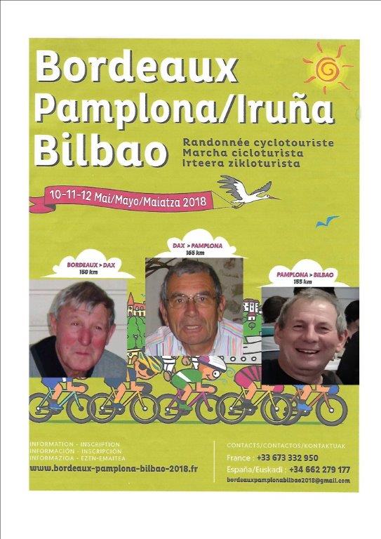 Paulo, Hervé et Germain étaient inscrits à la Randonnée Cyclotouristique Bordeaux/Pampelune/Irun/Bilbao organisée du 10 au 12 mai 2018. Paulo et Germain sont réellement partis sur leur destrier mais Hervé a dû déclarer forfait suite à une mauvaise blessure. Il décidait néanmoins de faire l’assistance et de suivre en voiture accompagné de son épouse Régine et de l’épouse de Paulo, Louise.