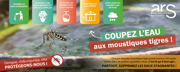 Pour tout savoir et télécharger les plaquettes d’information, consultez le site de l’ARS Nouvelle-Aquitaine-ARS-Santé.fr  ou consultez la Plaquette d’Information Nuisances et Maladies Moustique Tigre 2018.