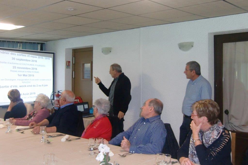 Puis, GERMAIN a présenté les projets pour 2019, et puisqu’en France tout se termine en chanson, c’est sur un air de musique tiré d’une ancienne cassette de SIMON, avec Mr DESCOS au chant accompagné par Mr CALZETTA à l’accordéon, que nous avons dégusté le dessert.