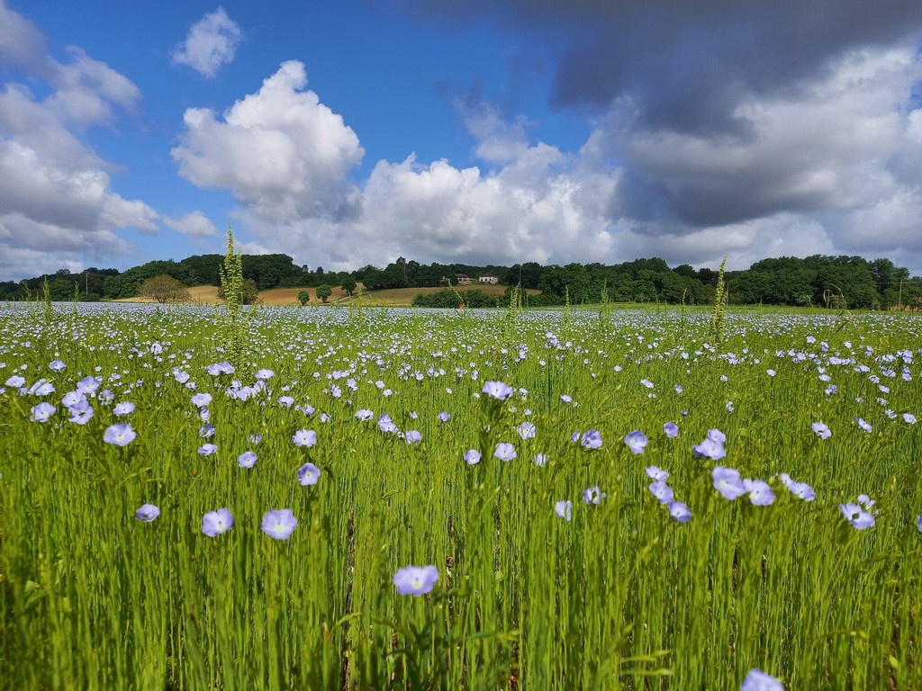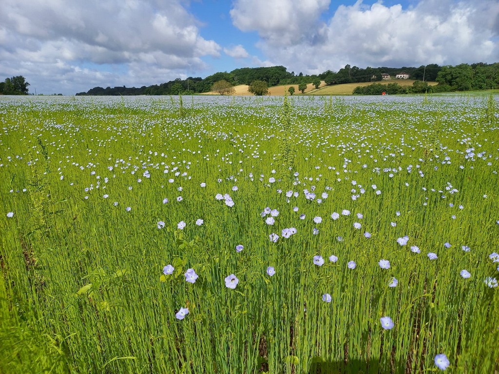 Cette culture observée sur une exploitation bio de La Sauvetat du Dropt est du lin. Non le lin qui servira à faire des textiles mais du lin oléagineux que vous pourrez consommer sous forme d’huile ou de graines alimentaires. Semé en début de printemps, sa croissance est rapide, ses racines nombreuses et puissantes améliorent la structure du sol. Il sera récolté en fin d’été.