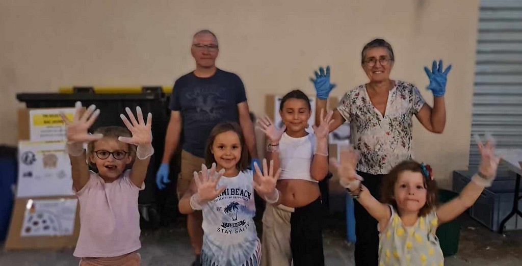 Ce vendredi 16 août, l’équipe du tri a bénéficié de l’aide de deux petites apprenties arrivées là avec la volonté de se rendre utile tout en s’amusant. Juliette et Valentina n’ont que 5 ans 1/2 et sont déjà très volontaires. Voyant leurs galopades incessantes pour prendre les déchets et reliefs de repas des bras des visiteurs ayant terminé la soirée, deux autres jeunes un peu plus âgées se présentaient et demandaient des gants pour prêter main forte. C’est ainsi que le très jeune tandem devenait quatuor et amusait beaucoup tous ceux qui les observaient.