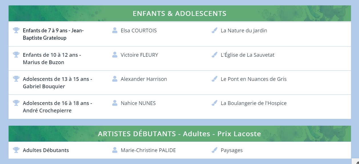 Le jury était composé de plusieurs artistes du village : Audrey Bastard, plasticienne; Houria Besse, aquarelliste, céramiste et Béatrice Aumônier, enseignante de l’Art du Chi.