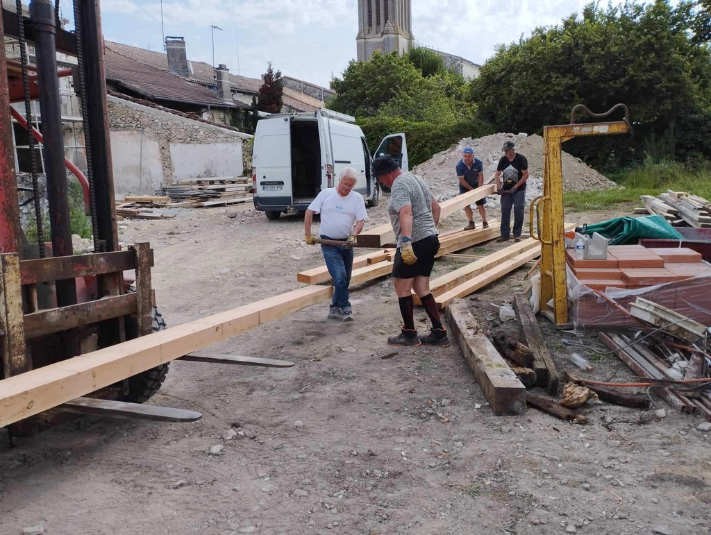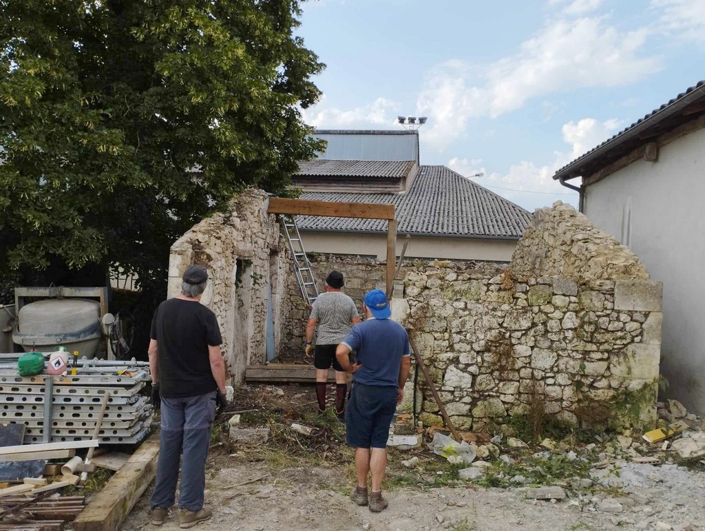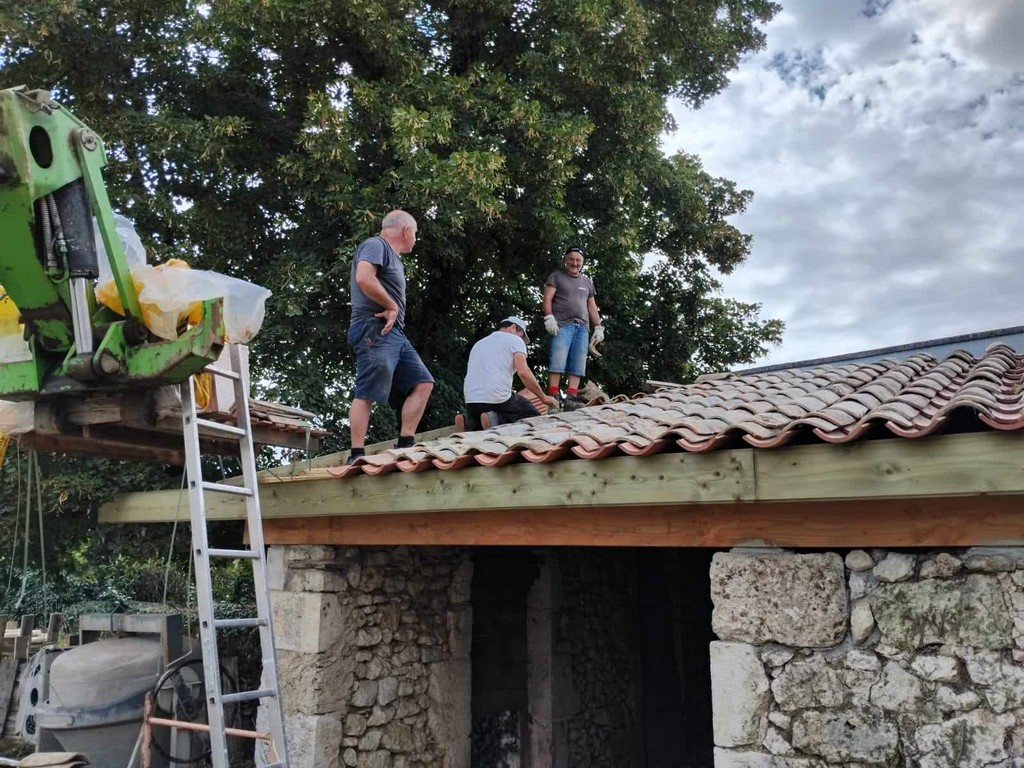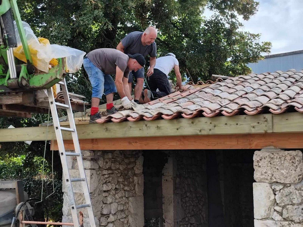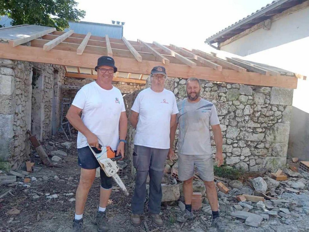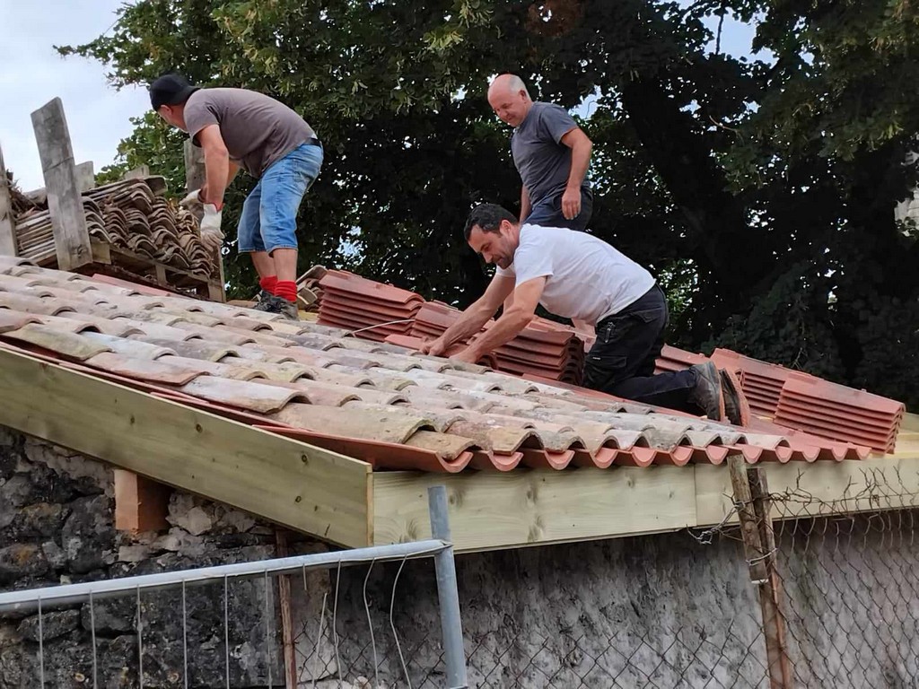 Au cours de la première semaine d’août, tandis que les entreprises en charge du gros-œuvre sur les Maisons Brugère sont en vacances, les travaux de réfection de la toiture des fours à pain vient de reprendre. A la manœuvre, monsieur le Maire Jean-Luc Gardeau, deux adjoints Germain Sauron et Jean-Paul Mothes, le conseiller Jeannot Garoste et des bénévoles Stéphane Bottin et Alain Crossoir. Un beau chantier qui va permettre de remettre en état et on l’espère, en service, ces deux anciens fours autrefois utilisés par la population sauvetatoise.
