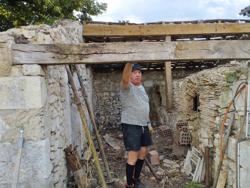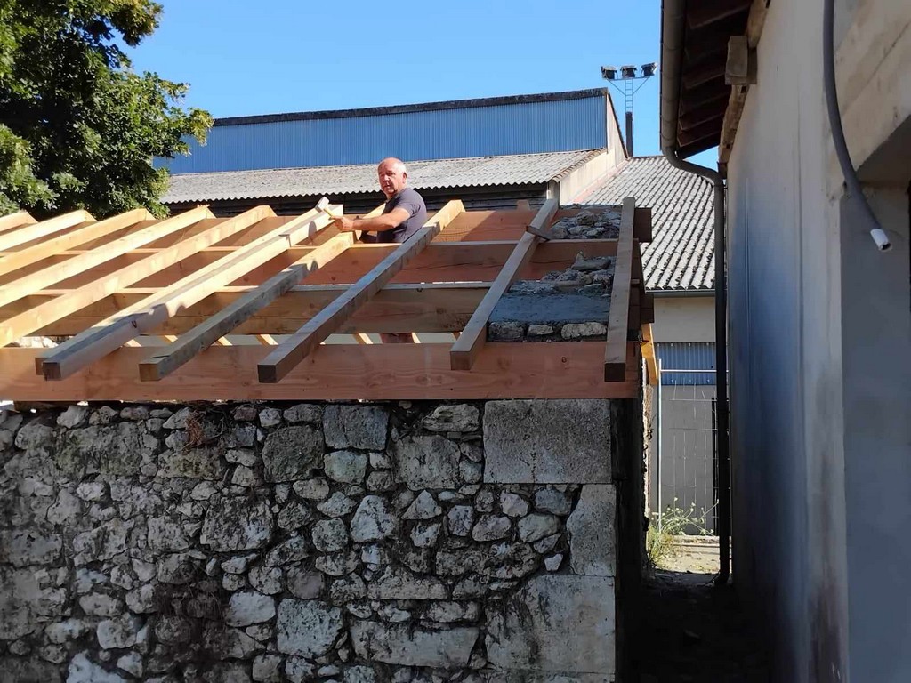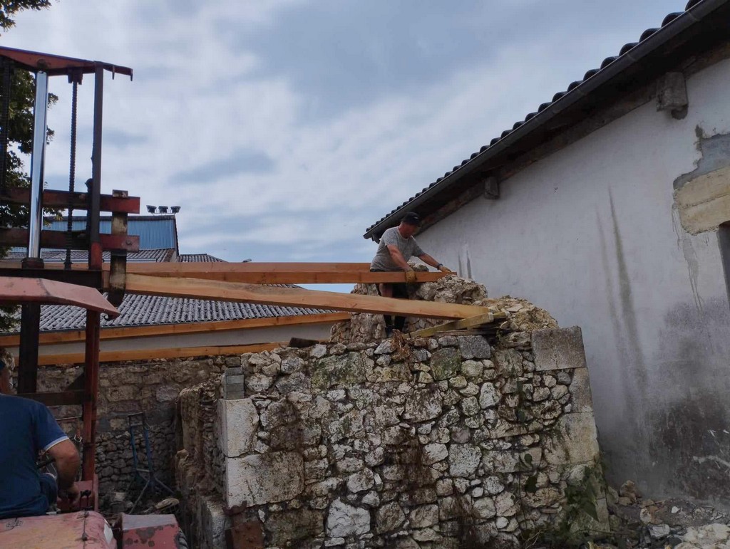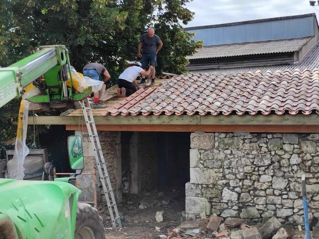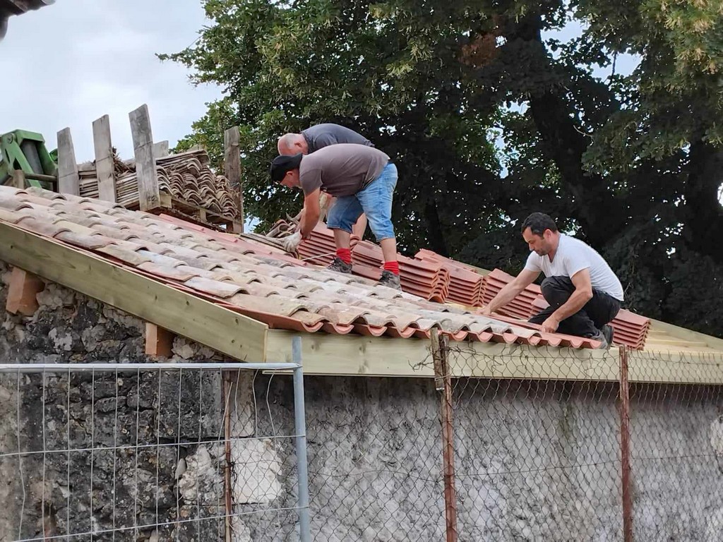 Au cours de la première semaine d’août, tandis que les entreprises en charge du gros-œuvre sur les Maisons Brugère sont en vacances, les travaux de réfection de la toiture des fours à pain vient de reprendre. A la manœuvre, monsieur le Maire Jean-Luc Gardeau, deux adjoints Germain Sauron et Jean-Paul Mothes, le conseiller Jeannot Garoste et des bénévoles Stéphane Bottin et Alain Crossoir. Un beau chantier qui va permettre de remettre en état et on l’espère, en service, ces deux anciens fours autrefois utilisés par la population sauvetatoise.
