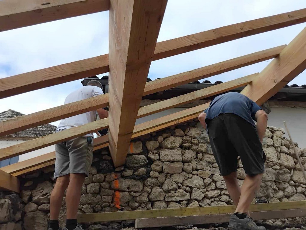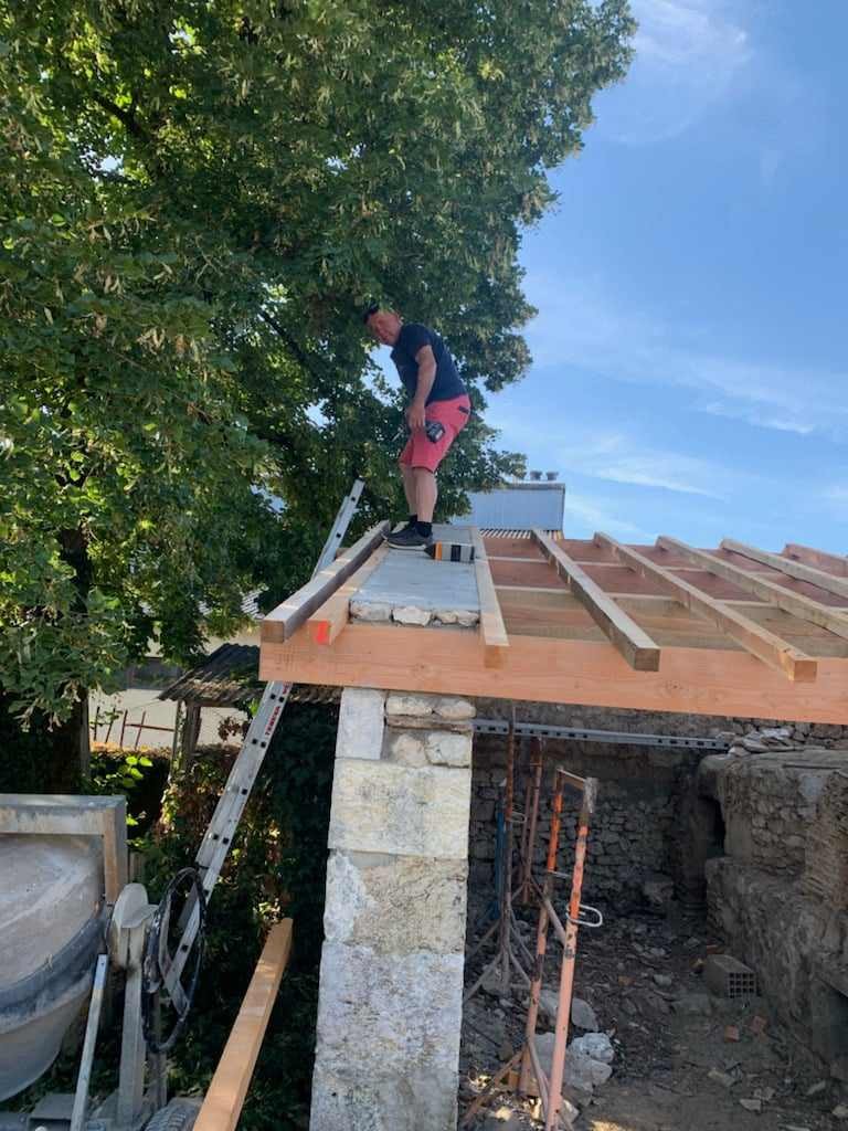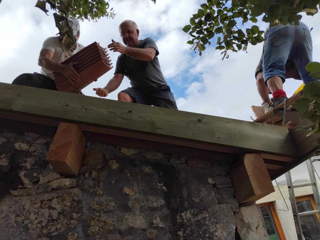 Et les travaux se poursuivent, la toiture des fours à pain est maintenant couverte grâce aux conseillers municipaux et adjoints qui n’hésitent pas à tremper la chemise chaque matin de ce mois d’août. On a pu voir en us des personnes citées auparavant : Jean-Pierre Tenot, 3ème adjoint et les conseillers Eric Vettorello et Pascal Dupin. Monsieur le Maire qui mène cette équipe n’est jamais très loin.