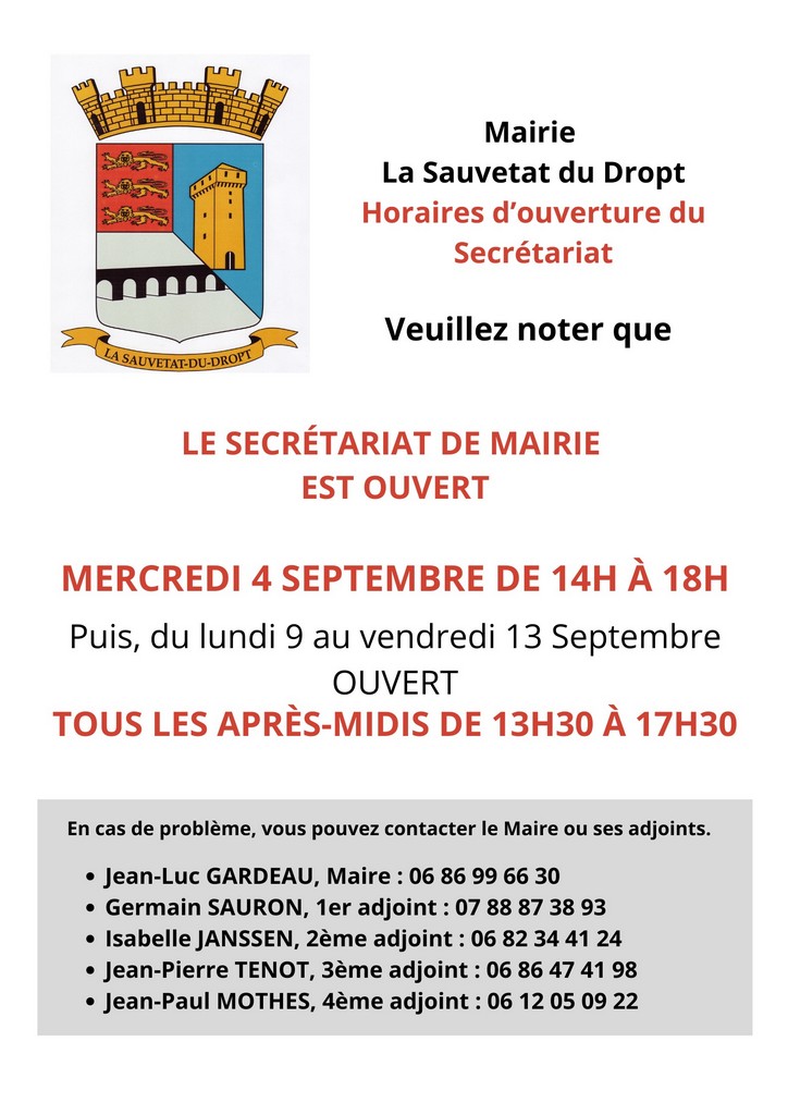 Info Mairie : Horaires d’ouverture du secrétariat pour les jours à venir