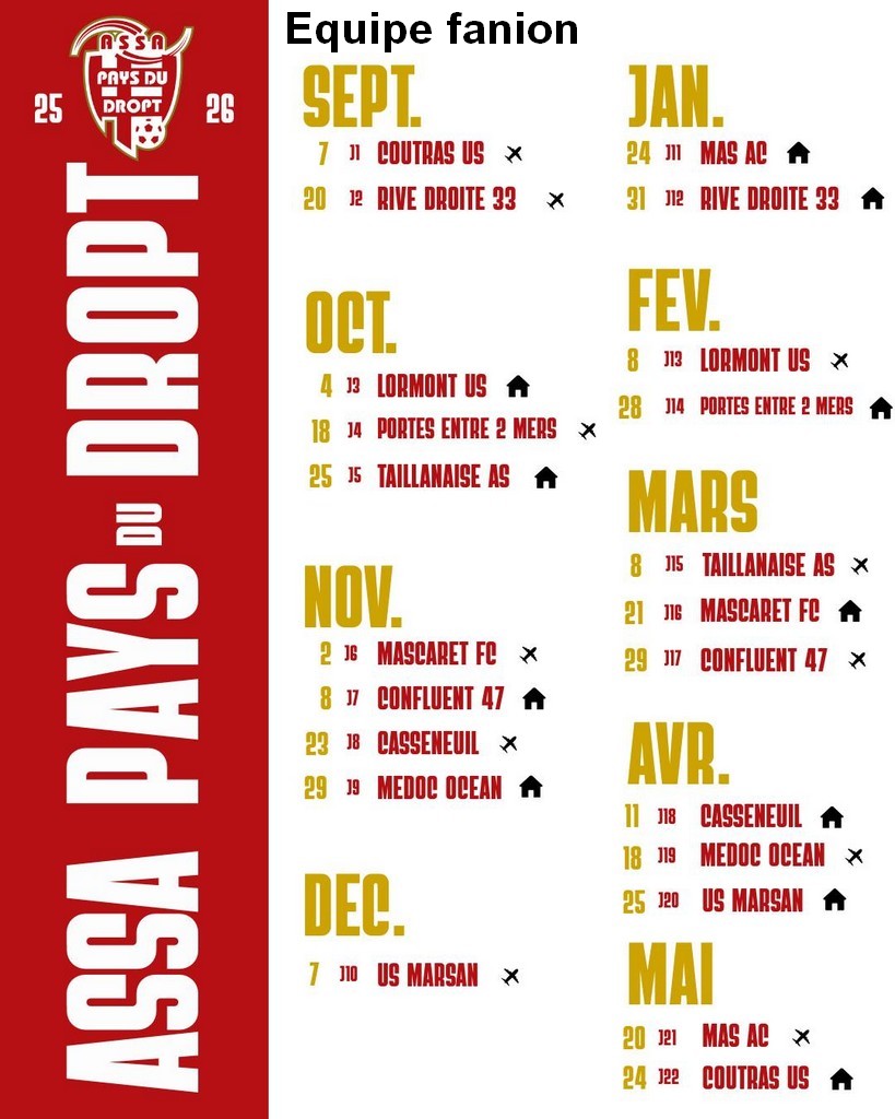 Découvrez le calendrier officiel de notre équipe fanion avec l’ensemble des matchs de championnat. Une saison prometteuse et pleine d’émotions nous attend, avec un coup d’envoi fixé au dimanche 7 septembre.