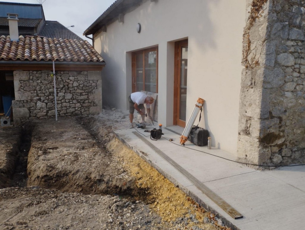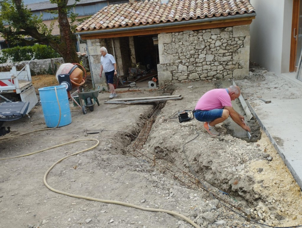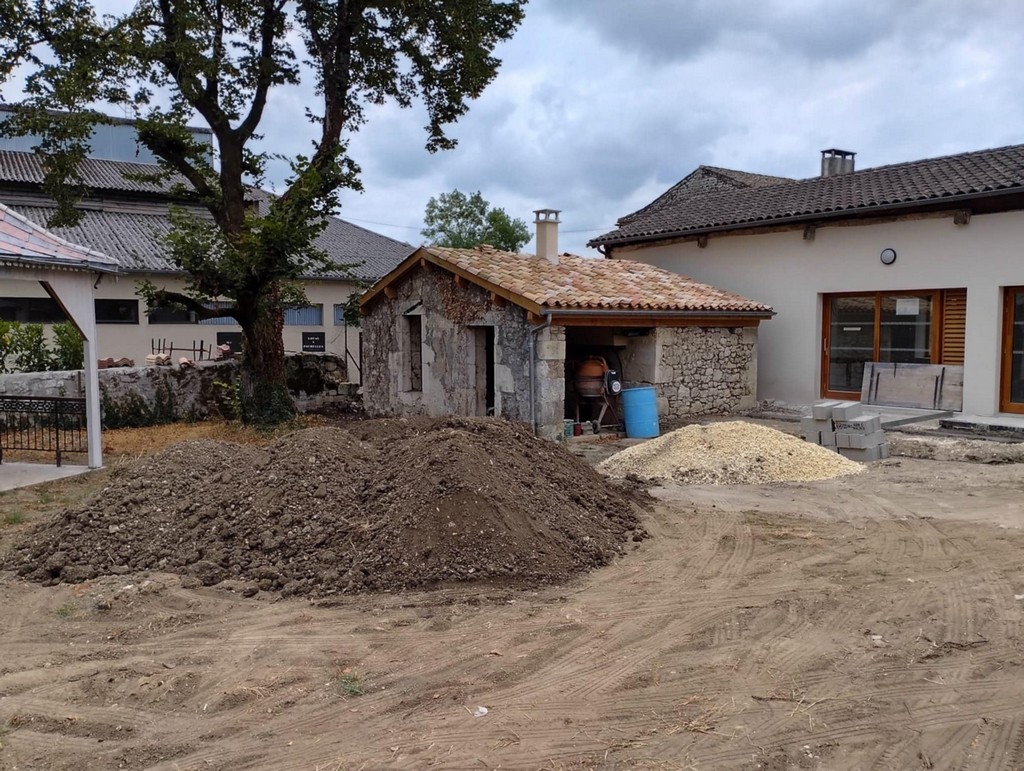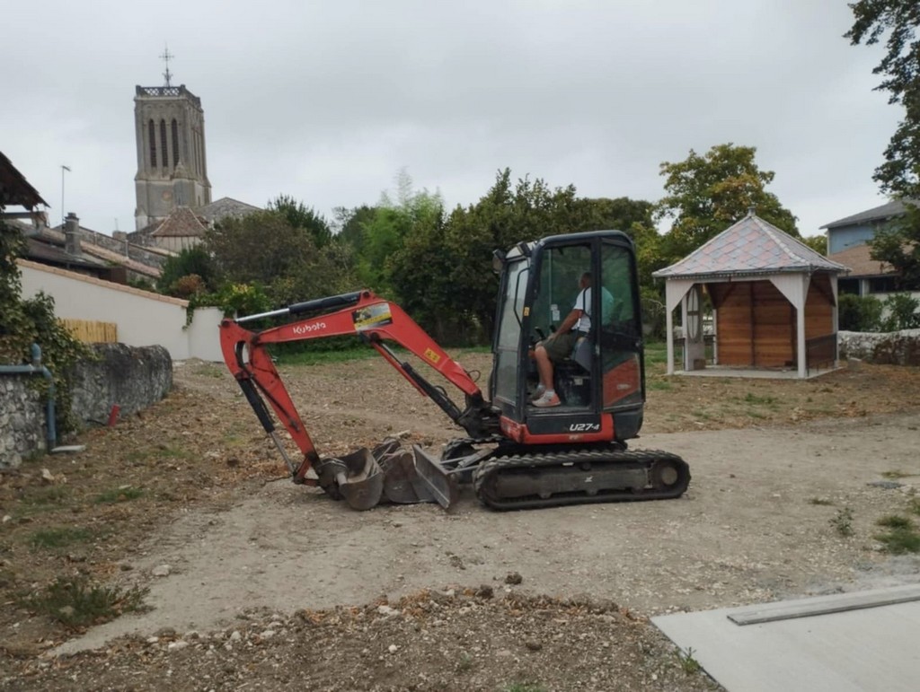 Cette semaine, un apport de terre végétale a été fait pour les espaces verts ainsi que la préparation du cheminement pour aller vers les fours à pain. D’autres travaux concernaient la terrasse de la maison commune qui sera accessible aux seniors bientôt locataires d’un des huit appartements situés dans les bâtiments qui lui font face. Dans les jours qui viennent une équipe spécialisée dans le bois posera pannes et lames pour l’habiller.