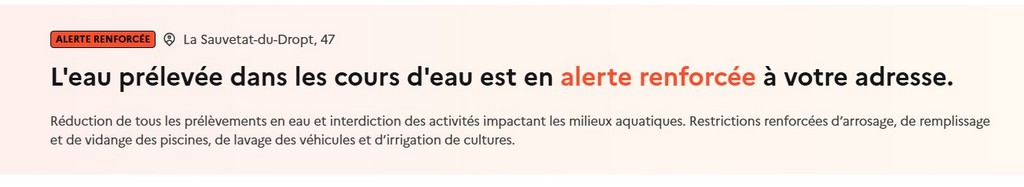 Ainsi, le Dropt est en alerte renforcée impliquant une suspension de 50% des prélèvements à usages agricole, hors abreuvement du bétail, de l’arrosage des jardins, des pelouses et des espaces verts.