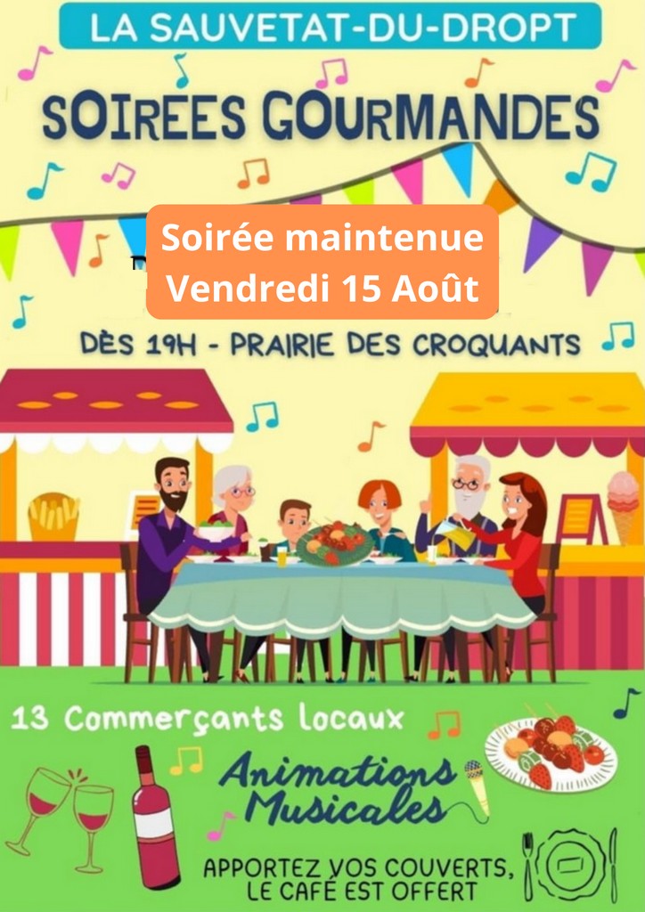 Malgré la chaleur et sans contre-indication de la Préfecture du Lot-et-Garonne, le Comité des Fêtes vous donne rdv pour a Soirée Gourmande de ce vendredi 15 août. Qu’on se le dise dans les chaumières !