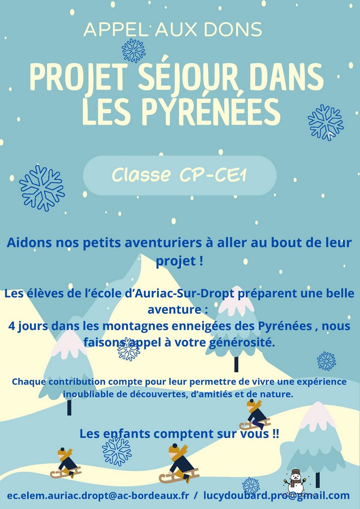 Je me permets de vous contacter en tant que déléguée des parents d’élèves de la classe de CP/CE1 de l’école d’Auriac-Sur-Dropt, afin de soutenir nos enfants à concrétiser leur projet : un voyage à la neige de trois jours dans les Pyrénées Ariégeoise.
