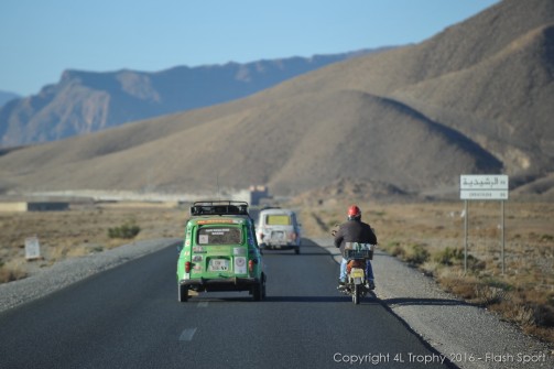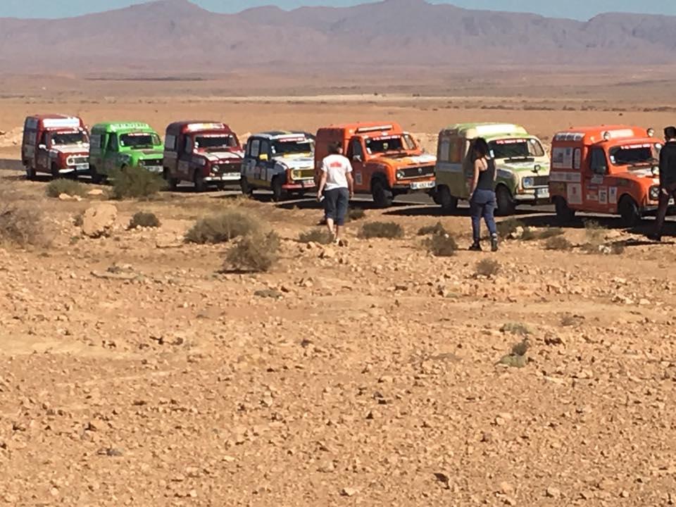 Ce lundi matin, ils doivent approcher le grand sud marocain en traversant les merveilleux paysages de l’Atlas et parcourir les 300 km qui les séparent de Merzouga. Le thermomètre grimpe en flèche. Les premières 4L arrivent au bivouac de Merzouga dès le milieu de la journée. Pas de nouvelles des garçons, leur facebook est muet. Concentrés certainement mais, peu importe l’heure, ils y parviennent.