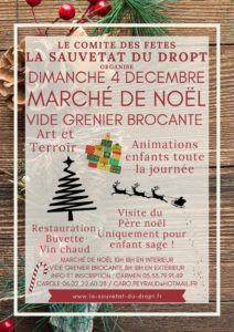 L’association Arts et Cultures en Liberté organise un Marché de Noël des artisans locaux les samedi 29 et dimanche 30 novembre dans la salle des animations de La Sauvetat du Dropt.