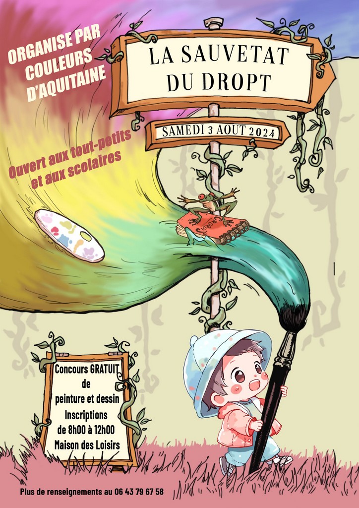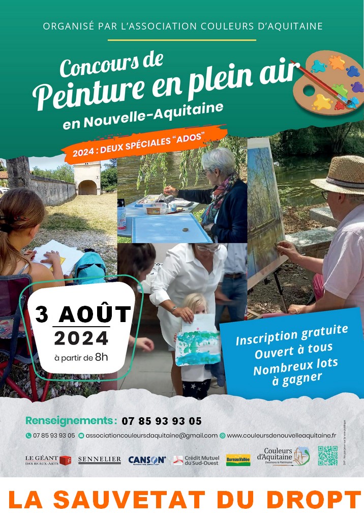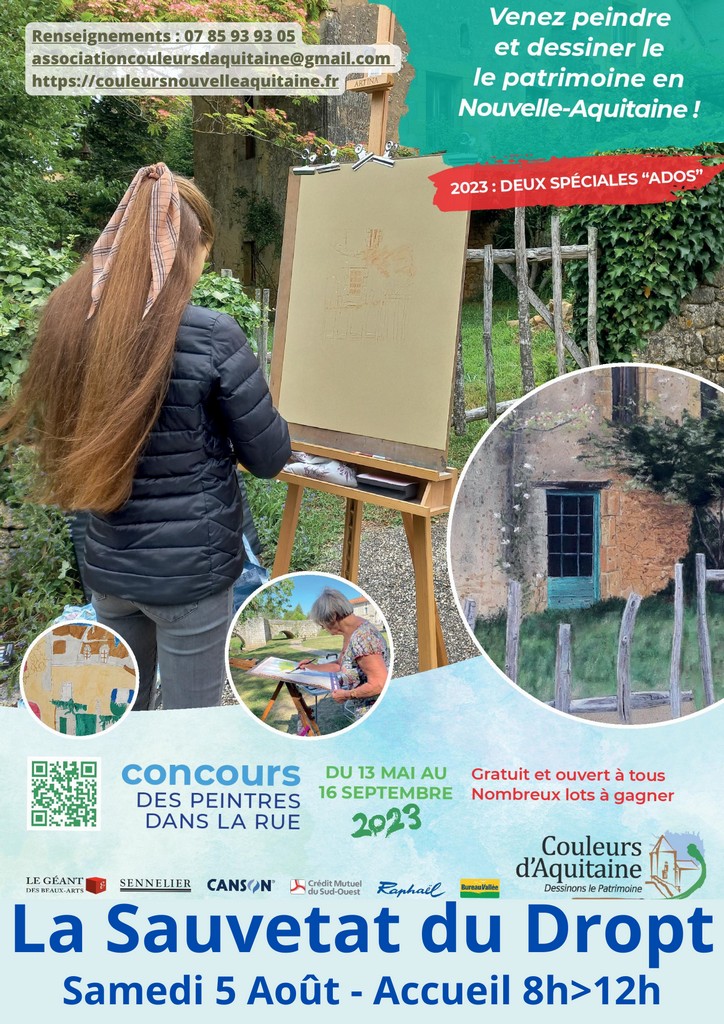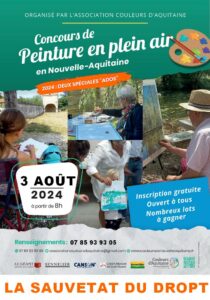 Dans le cadre de la Fête Votive, l’association Couleurs d’Aquitaine de Pessac (33) et l’association Arts et Cultures en Liberté organisent un Concours pour peindre ou dessiner le patrimoine matériel ou immatériel de La Sauvetat du Dropt. Pour adultes et enfants, professionnels ou amateurs.