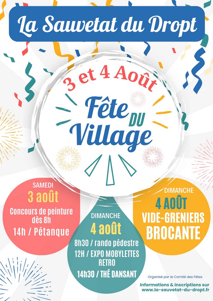 Le Comité des Fêtes organise, en partenariat avec d’autres associations du village, sa traditionnelle Fête Votive du 1er week-end d’août. Plusieurs activités proposées à voir en détail sur cette page (affiches 2025 à venir)
