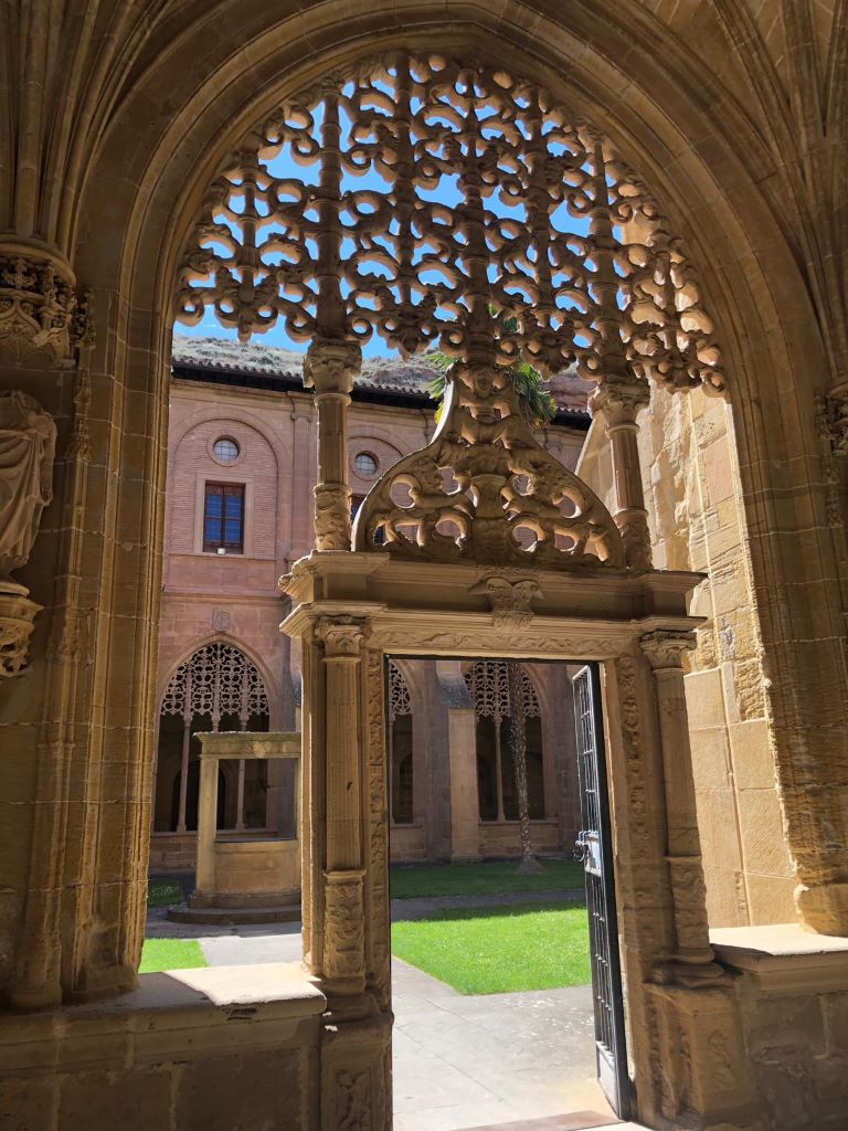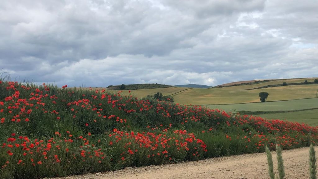 Voici son journal de bord du 21 juin : « Je suis dans le bus du retour … les étapes se sont enchaînées, tellement riches d’événements et de rencontres que j’en ai un peu oublié mes envois ! Torres del Rio et sa très belle église romane, Logrono, grande ville où je dis au revoir à Noela, pèlerine espagnole qui rentre à Madrid où elle doit reprendre un traitement … Najera et sa fabuleuse abbaye. Là, je retrouve le bonheur intense de tremper les pieds dans un torrent de montagne … très belle rencontre d’un couple de néo-zélandais … départ de Najera dans les vignes puis les champs de céréales accompagnés de leur bordures de coquelicots !