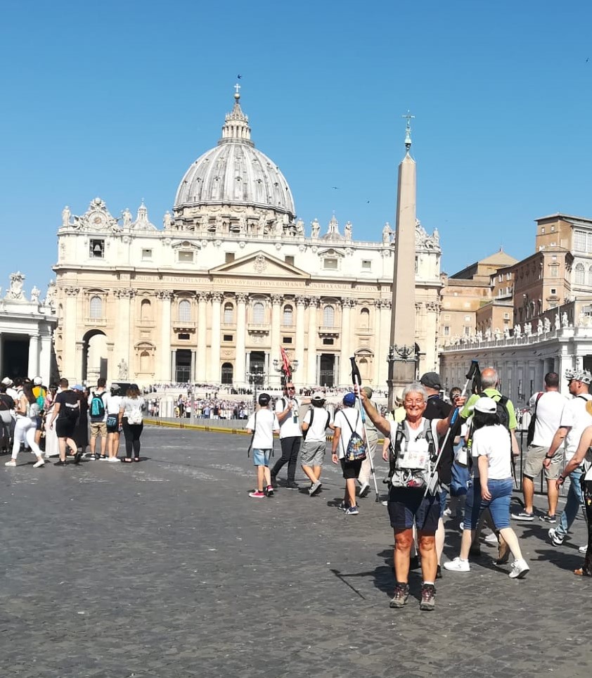 Et enfin, l’arrivée mercredi 26 vers 10h, Photo à l’appui prise devant le Vatican par une pèlerine rencontrée en chemin. Aucun commentaire, pas de mots pour exprimer cette victoire. La photo arrive via le portable d’une amie parce que celui de Martine n’est pas équipé. On peut imaginer la joie, la fierté, le désarroi peut-être un peu aussi de ne plus avoir ce but d’aller de l’avant … Nous lui donnons rendez-vous cet hiver pour une soirée où elle racontera ce long périple…