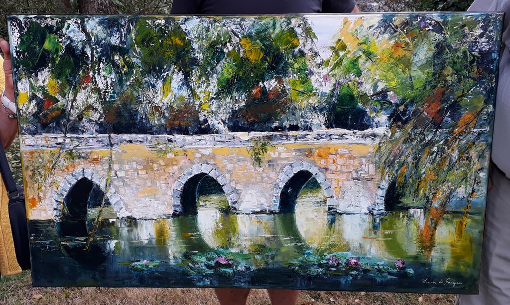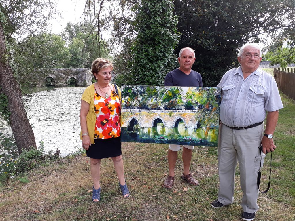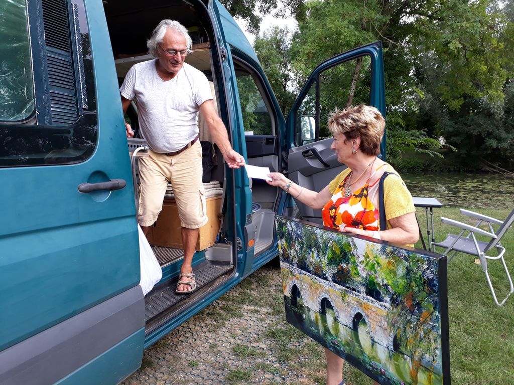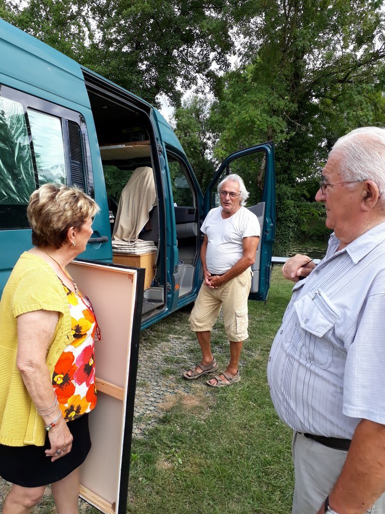 Ce fut donc vendredi 4 août que Pierrette vint à la mairie pour faire don de son tableau à Monsieur Gardeau. Après quelques clichés pris dans la salle du conseil, il fut décidé de se déplacer au bord de la rivière en passant par l’aire de camping-car pour photographier l’artiste et son tableau à l’endroit même où fut prise la photo qui lui servit de modèle. Parlera-t-on ici de hasard ou de destin? Toujours est-il que le groupe fut arrêté sur le retour par le propriétaire d’un véhicule aménagé souhaitant voir le tableau de plus près. Regard de professionnel puisqu’il avoua timidement être propriétaire d’une Galerie d’Art Contemporain à Nantes. S’en suivit un échange de coordonnées qui permettra peut-être à Pierrette alias Louise de Fargues d’exposer ses œuvres dans cette ville.