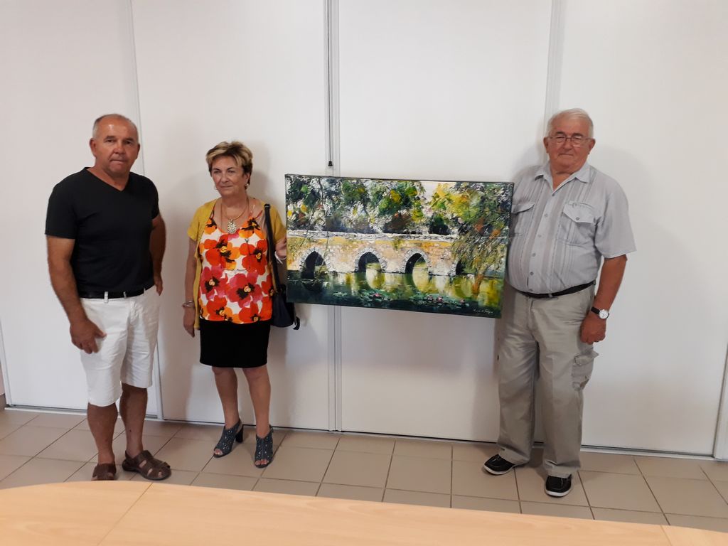 Jean-Luc Gardeau, Maire de La Sauvetat du Dropt, a eu le privilège de recevoir, pour sa mairie, un magnifique tableau du Pont Roman de la part de Louise De Fargues, artiste peintre qui se partage entre la commune de Moustier et celle de Courcelles sur Seine où elle vit avec Pierre son mari.