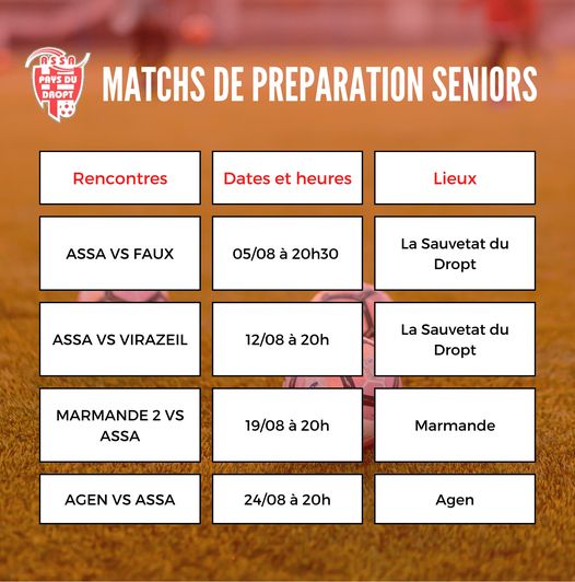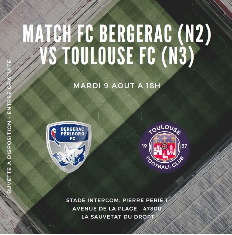 Le Mardi 9 Août, l’ASSA Pays du Dropt reçoit le club de Bergerac pour un de leur match de préparation face à la réserve du Toulouse FC. Venez profiter de ce match de haut niveau, l’entrée au stade Pierre Périé est gratuite.
