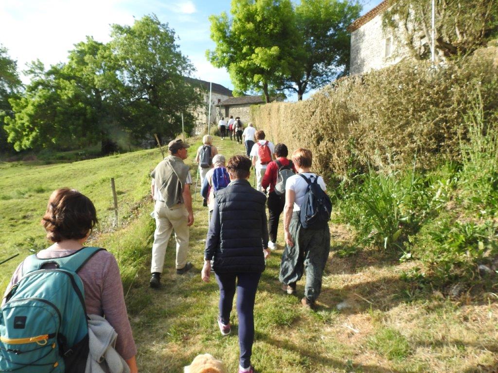 En continuant, on emprunte un étroit chemin creux avant d’arriver sur la route de Soumensac, tout près du lac, puis de reprendre le chemin de terre à Bellone. Quand nous approchons de la route de Ste Foy, quelques marcheurs fourbus décident de rentrer directement tandis que le gros de la troupe poursuit par les bois puis les vignes pour finalement redescendre au village après 3 heures de marche.