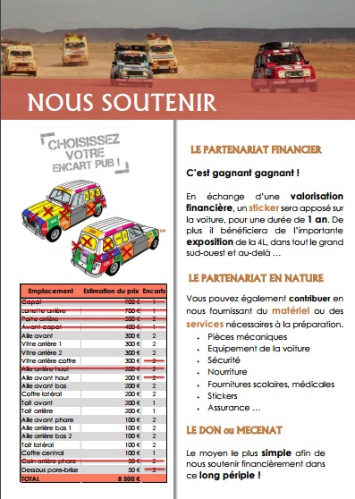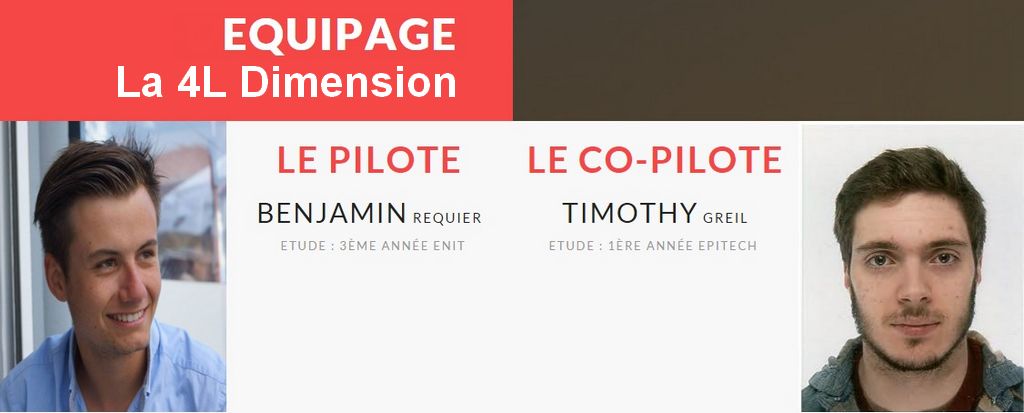 Un raid humanitaireL’objectif est d’aider à la construction d’écoles et d’apporter sur place des fournitures scolaires. Une collecte alimentaire est également organisée par la Croix-Rouge. En créant l’association 4L Dimension, Benjamin et Timothy peuvent collecter des dons (pièces mécaniques, équipement de voiture, fournitures scolaires, nourriture…) et accepter des sponsors pour boucler leur budget. A ce jour, il manque quelques sponsors. Tous les détails sont sur le dossier à consulter ICI. |