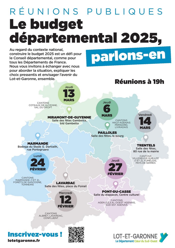 Cette série d’événements s’inscrit dans la perspective de l’adoption du budget départemental à la fin du mois de mars. La présidente a souhaité, avec la majorité départementale, venir à la rencontre de toutes et tous pour expliquer à nouveau la situation, échanger sur les arbitrages pressentis et envisager l’avenir du Lot-et-Garonne ensemble.