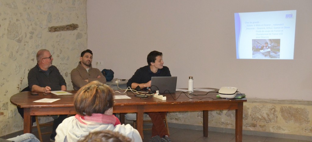 Emilien poursuit en détaillant la compétition. Les entraînements qui lui ont fait retrouver une forme olympique qu’il croyait perdue apparemment (sourire dans l’assistance) et les épreuves du championnat mondial au nombre de 3, une descente, un slalom et un cross.