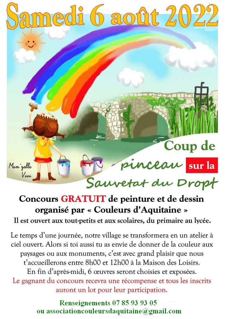 Samedi 6 Août, le Concours de « Couleurs d’Aquitaine» revient à La Sauvetat du Dropt, organisé conjointement par les Amis de la Sauveté, la Municipalité avec l’appui technique et expérimenté de l’association Couleurs d’Aquitaine.