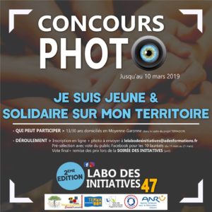 Dans le cadre de sa participation au projet TERRADOR (programme d’actions en faveur de la jeunesse), l’ADES via son Labo des initiatives (facebook) lance un concours destiné aux 13 / 30 ans. L’objectif est de proposer une photo sur le thème de « Je suis jeune et solidaire sur mon territoire » (voir règlement ci-dessous).