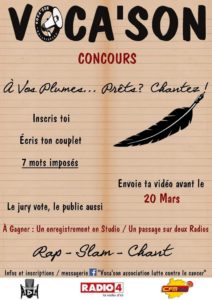 Inscris-toi. On te donne 7 mots que tu intègres dans ton texte. Interprète ce texte en vidéo, envoie tout ça à l’asso. Le 20 mars le jury de Voca’son donne son verdict. Le vote sera ouvert au public pendant une semaine et sera ajouté à celui du jury.