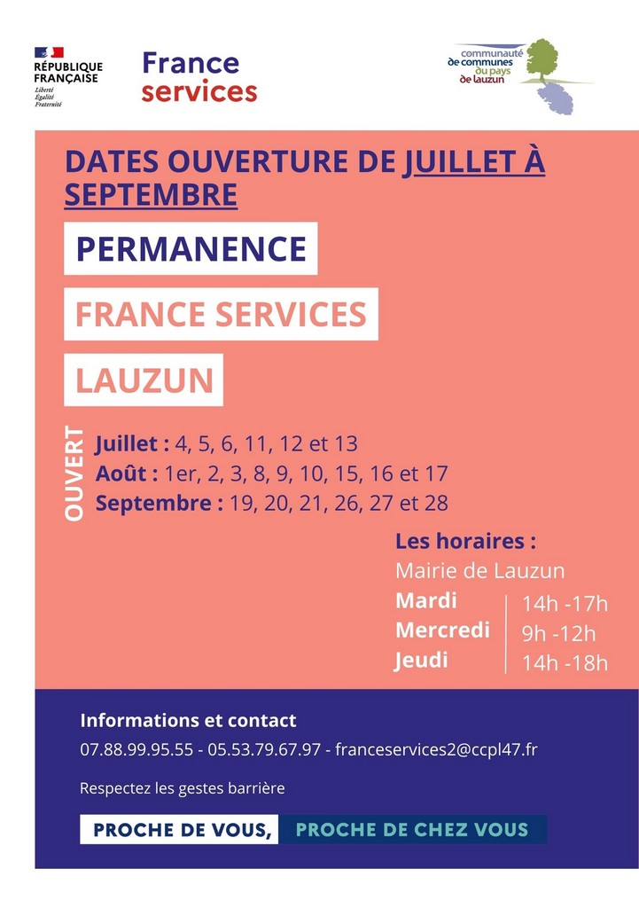 La France Services de Lauzun peut vous aider dans toutes vos démarches administratives. Veuillez noter les dates d’ouverture de juillet à septembre.