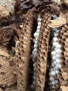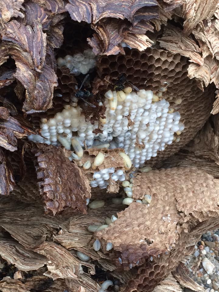 « Le nid est fait à base de fibre de bois qui sont assemblés en écailles. Celui-ci faisait environ 50 cm de hauteur. L’intérieur est fait de plusieurs plateaux qui sont reliés entre eux par des fixations ressemblant à des aiguilles. Les alvéoles sont remplies de larves de plusieurs générations. On peut estimer la présence de plusieurs milliers d’individus dans un nid de cette taille. Il y a les travailleuses qui partent chercher la nourriture et les fondatrices qui restent dans le nid avec la reine.