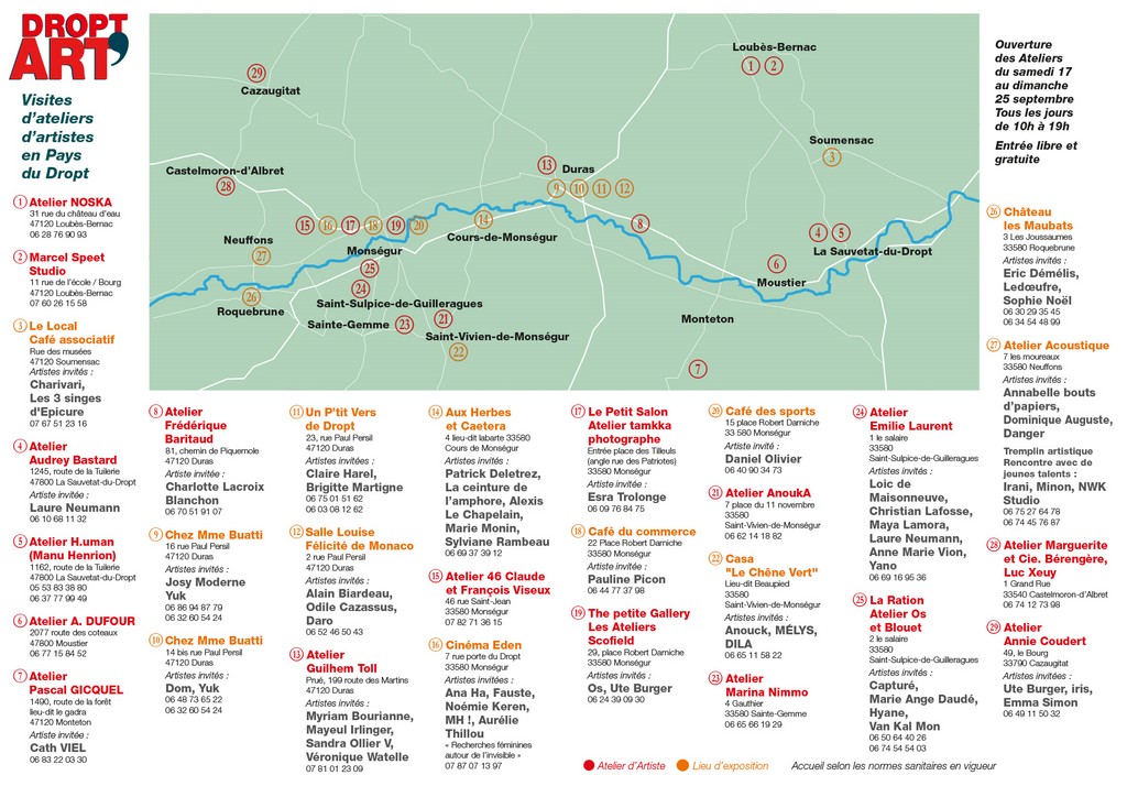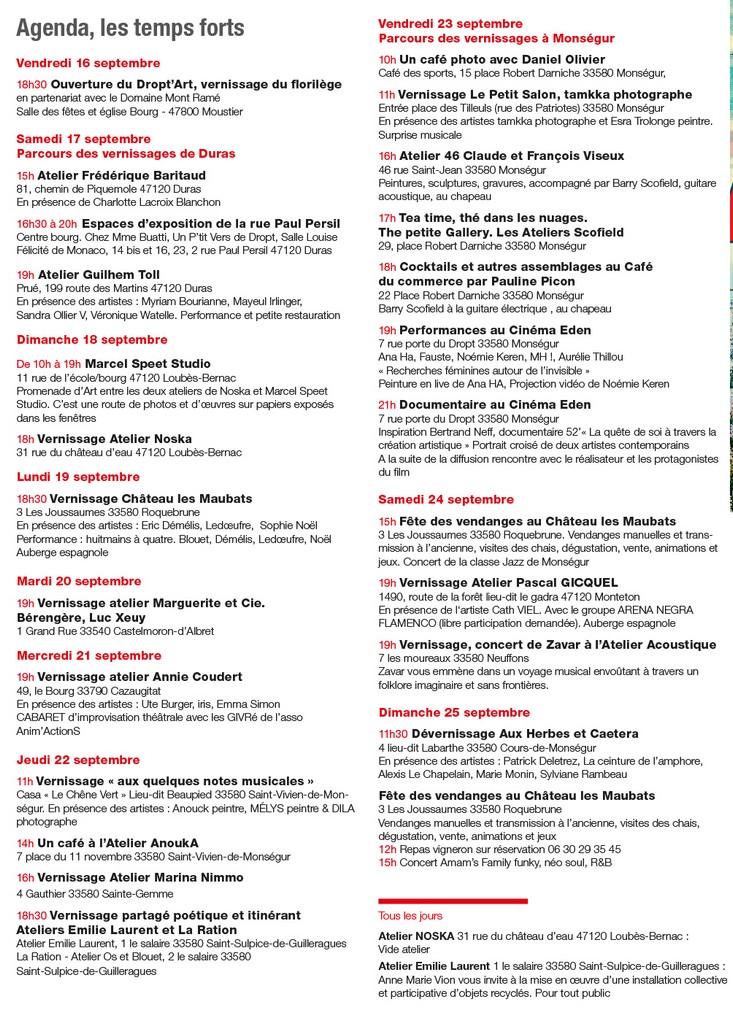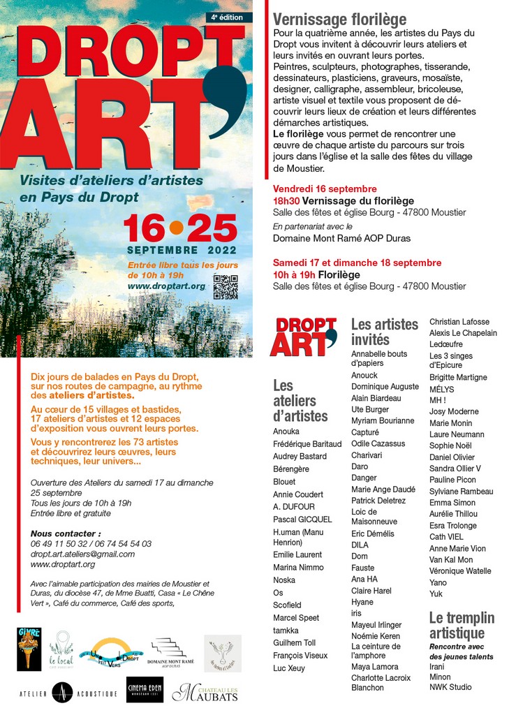 Pour la quatrième année, les artistes du pays du Dropt vous invitent à découvrir leurs ateliers et leurs invités en ouvrant leurs portes.