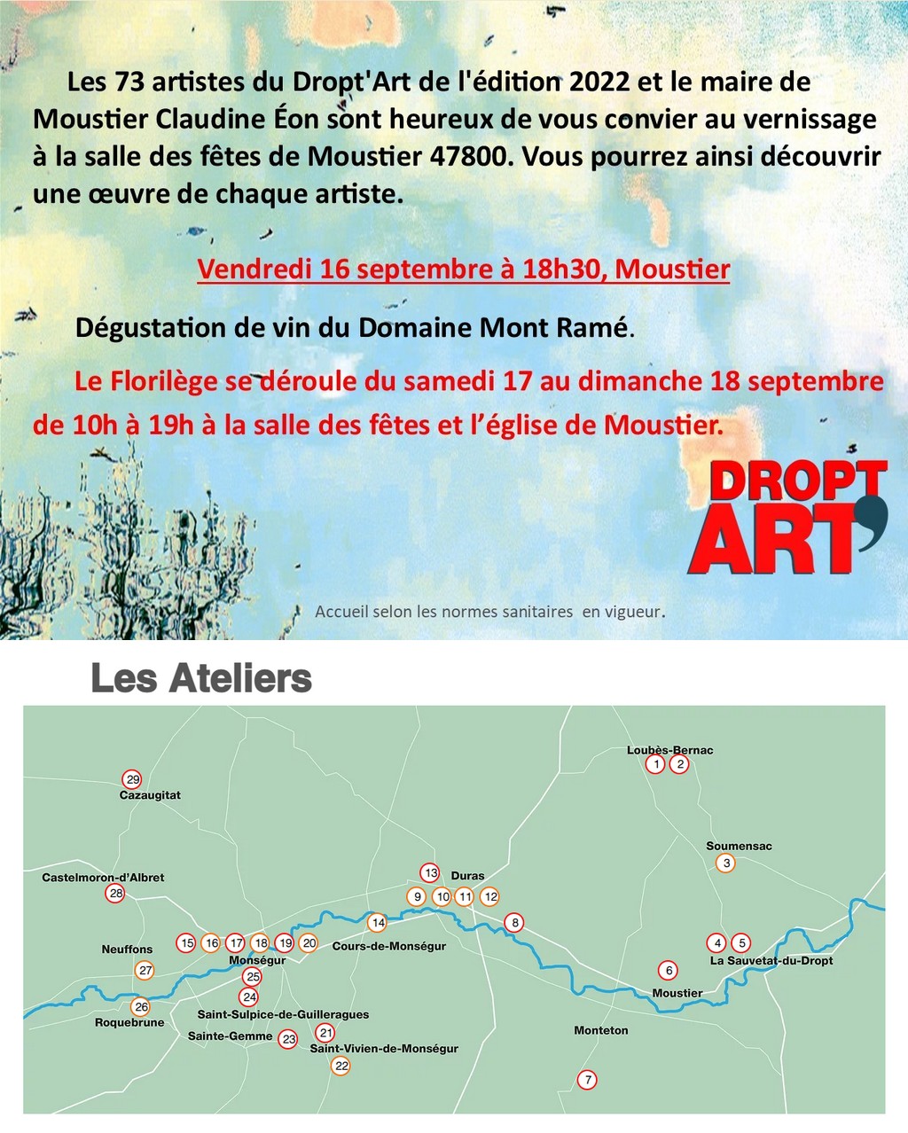 Pour la quatrième année, les artistes du Pays du Dropt vous invitent à découvrir leur atelier et pour certains leur invité en ouvrant leurs portes au cœur de 15 villages et bastides, 17 ateliers d’artistes et 12 espaces d’expositions à l’occasion de DROPT’ART du 16 au 25 septembre.
