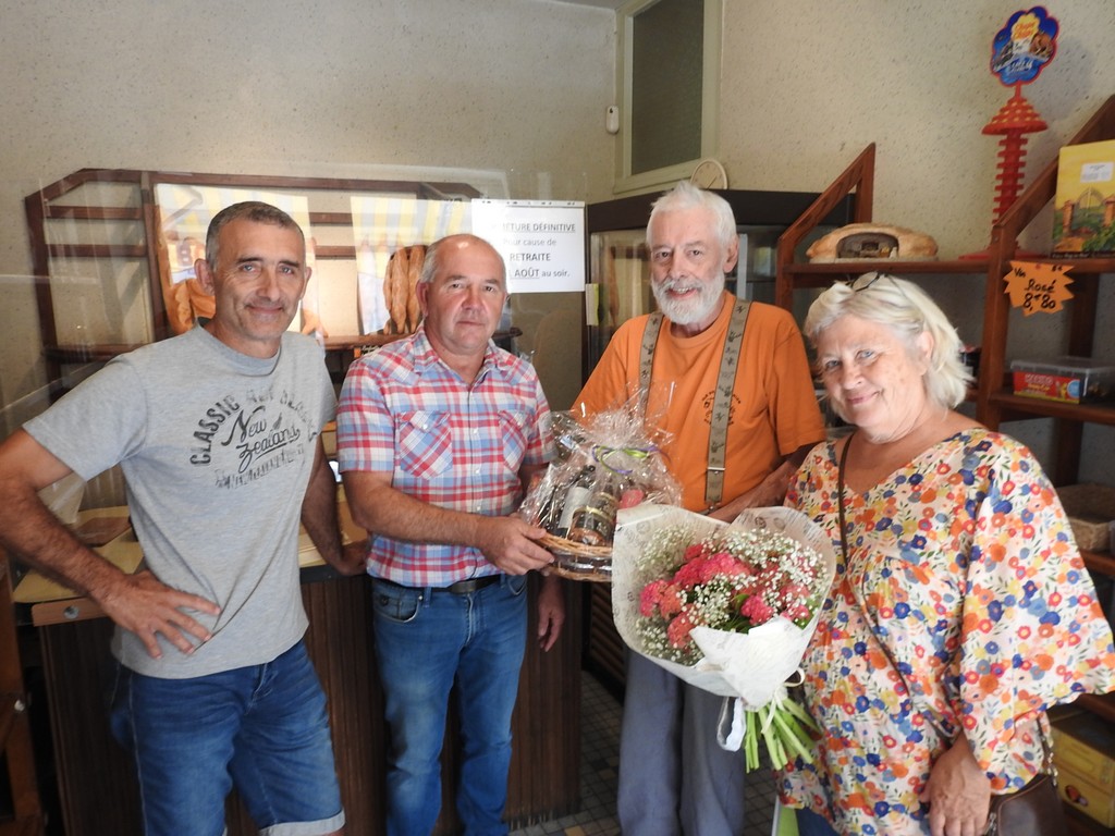 Mardi 31 août en matinée, pour marquer ce départ en retraite qui va laisser un vide dans l’Avenue de Grammont, Francis recevait la visite de clients, venus offrir une imposante composition florale, ainsi que du Maire Jean-Luc Gardeau accompagné de 2 adjoints et d’une conseillère municipale. Chargés d’un panier garni commandé au PROXI P’tit Panier du Dropt et d’un bouquet pour Yolaine, absente puisqu’elle faisait sa dernière tournée, les représentants de la commune souhaitaient remercier le couple Demadrille pour leur présence indéfectible. Tout particulièrement Francis pour les longues heures de nuit à pétrir le pain durant ces 26 années. Ils lui souhaitent un repos largement mérité, de prendre soin de sa santé et de profiter de toute sa petite famille.
