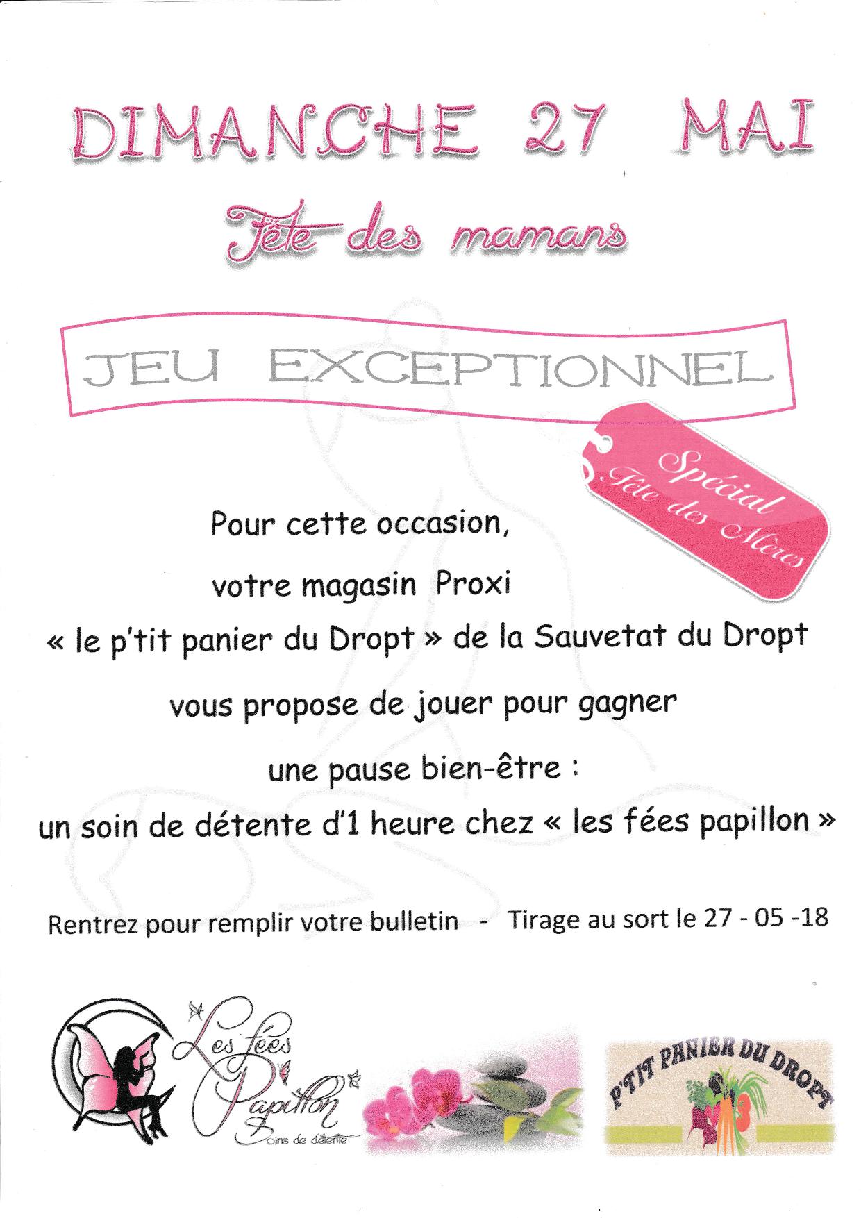 Ou au PROXI P’TIT PANIER du DROPT où Christine Pénicaud vous propose de déposer un bulletin dans l’urne pour gagner un soin de détente d’1h dans le salon de massage Les Fées Papillon de Marie-France Grannereau. Le tirage au sort sera effectué le dimanche 27 mai.
