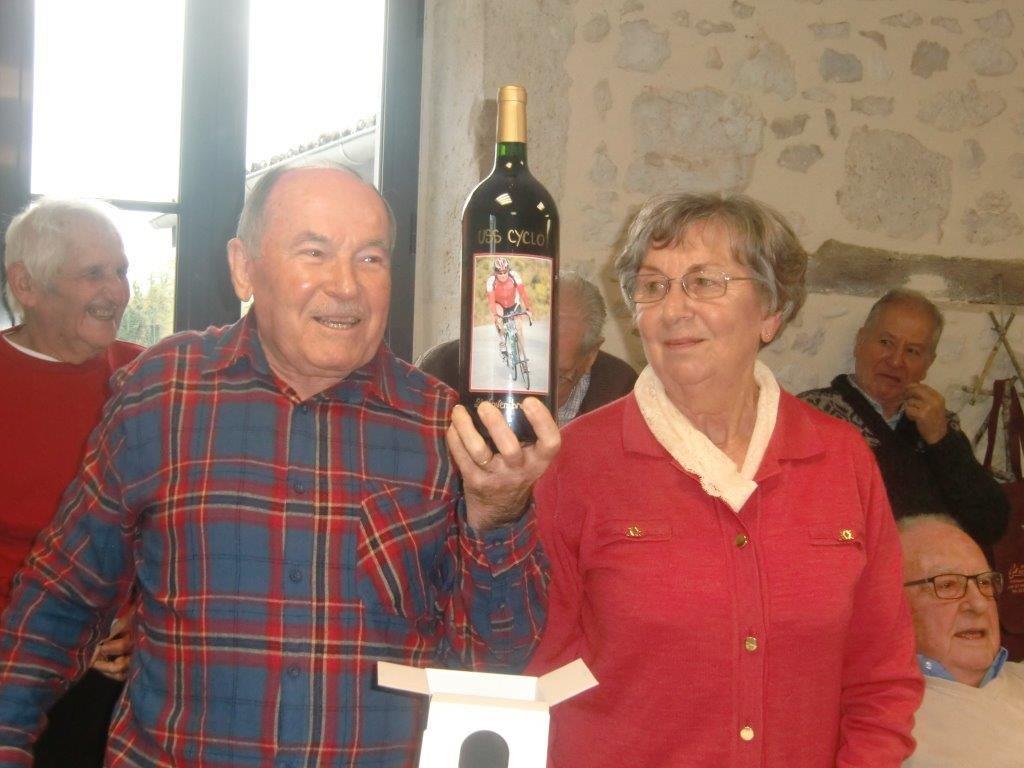 La rétrospective de la saison écoulée, animée par un diaporama, faisait peu à peu monter l’ambiance, ponctuée de commentaires plus ou moins objectifs mais toujours amplifiés par de grands éclats de rires. Journée festive, où l’on se retrouve avec les moins jeunes qui ont fait la gloire et la renommée de l’USS bien avant nous, occasion aussi d’honorer un des leurs. Car contre toute attente (pour lui en tout cas), c’est YVES qui a fait les frais de l’opération. Nous savons tous qu’il a eu plusieurs fois vingt ans cette année et qu’il a été dans l’obligation de mettre un terme à sa grande passion, après cent soixante dix huit milles huit cent quatre vingt dix kilomètres (178890 !… chez Yves on ne transige pas avec les chiffres !) sur les routes de France, premièrement pour raison médicale, mais aussi pour Annette qui appréhendait sérieusement les sorties après ses trois chutes.