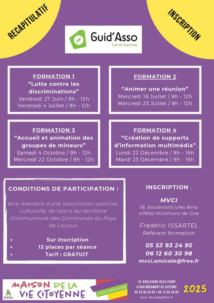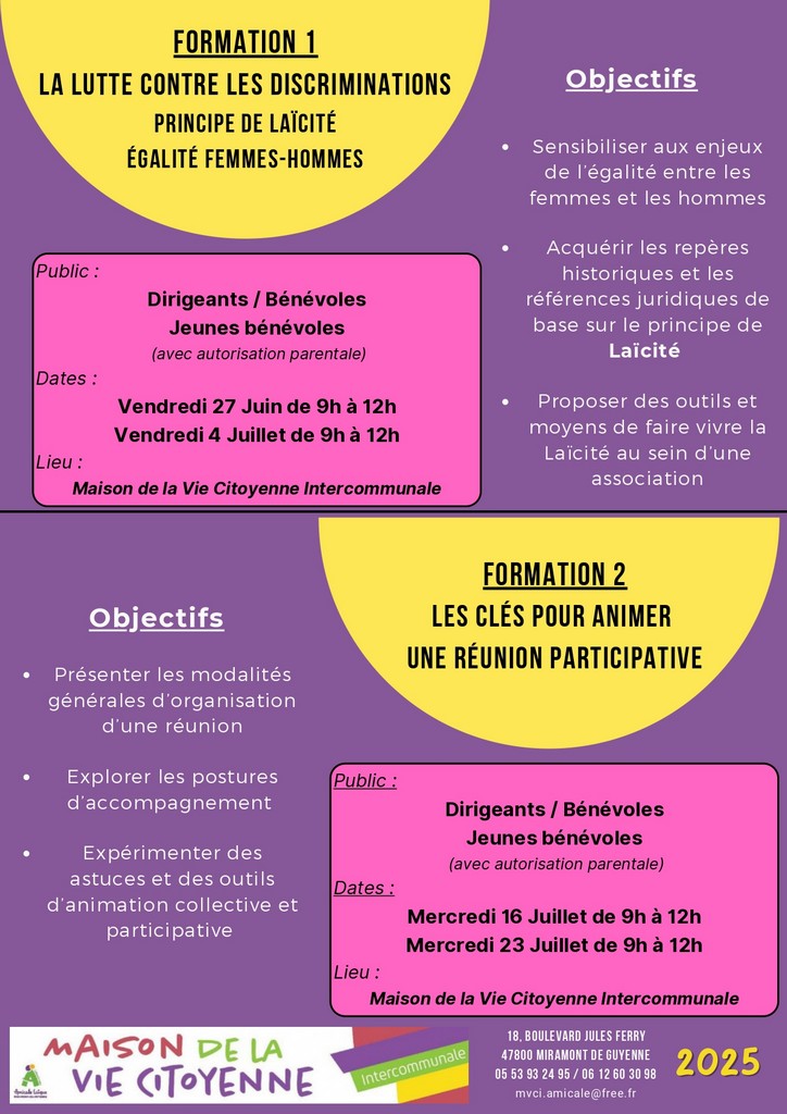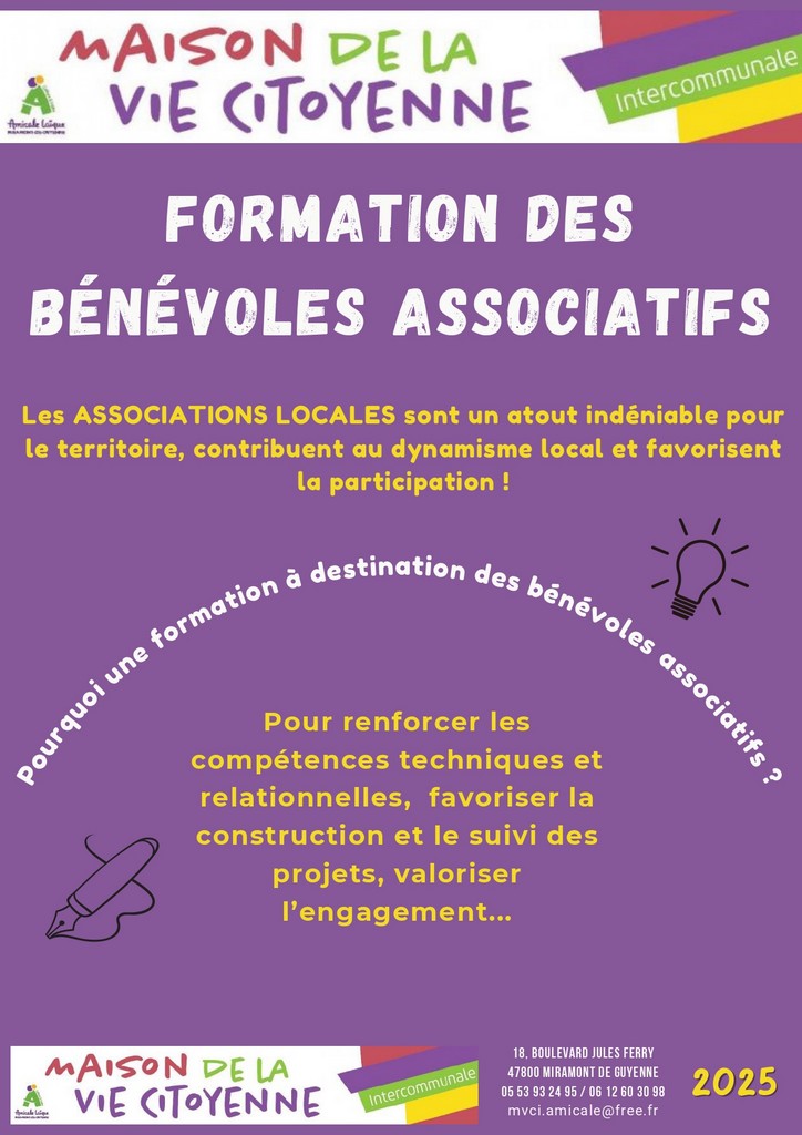L’Amicale Laïque de Miramont de Guyenne, labellisée Guid’Asso 47 depuis 2022, propose un catalogue de formations à destination des bénévoles associatifs, soutenu par le Région Nouvelle-Aquitaine via le dispositif FDVA (Fonds de Développement à la Vie Associative).