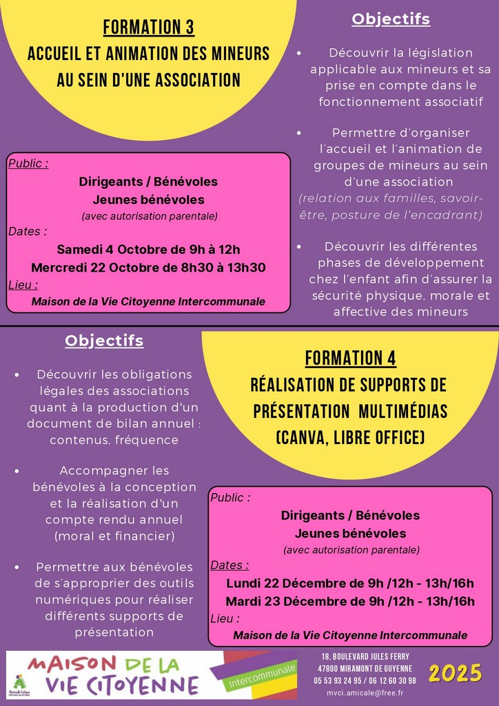 Les formations se déroulent dans les locaux de la Maison de la Vie Citoyenne Intercommunale et sont entièrement gratuites pour les bénévoles, qu’ils soient membres de bureau, élus au conseil d’administration, membres actifs, adhérents…