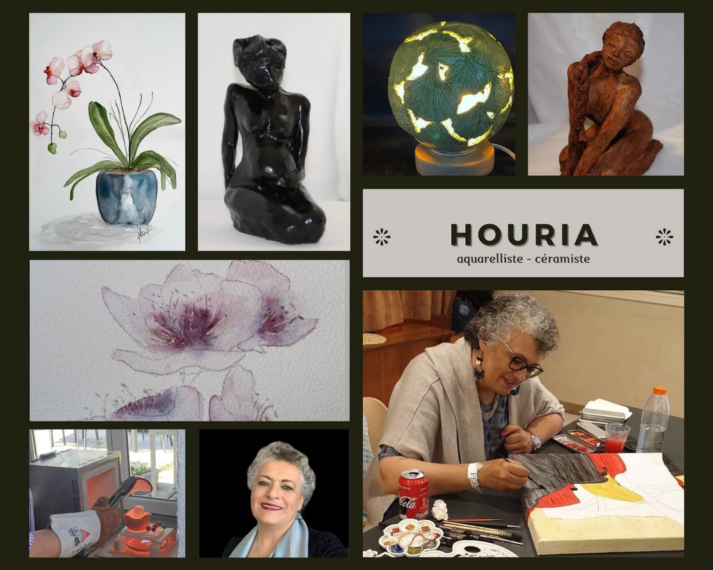 Artiste aquarelliste cotéeLorsqu’on demande à Houria ce qui a fait qu’elle devienne artiste, elle se plaît à répondre : « Je suis tombée dans la marmite de l’art toute petite. »