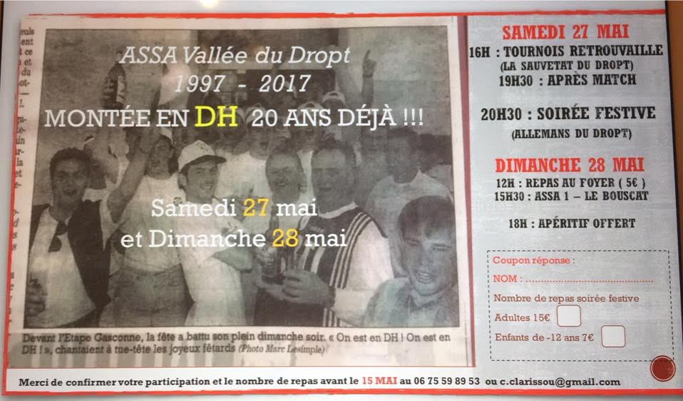 Le samedi 27 mai à partir de 16 heures des anciens de l’ASSA – Pays du Dropt organisent une soirée retrouvailles au stade intercommunal de la Sauvetat du Dropt avec un tournoi entre 4 équipes, dont celle de la saison 1996-1997, au cours duquel sera mis en jeu le Trophée Raymond Baldisser .