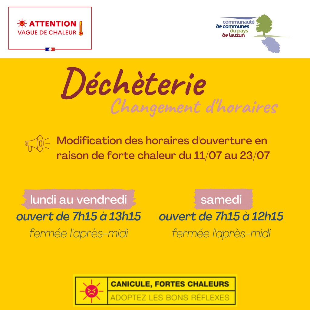 La Communauté de Communes du Pays de Lauzun vous informe qu’en raison des fortes chaleurs prévues les deux prochaines semaines, la déchèterie de Miramont de Guyenne sera fermée les après-midi et ouverte selon les horaires et jours suivants :