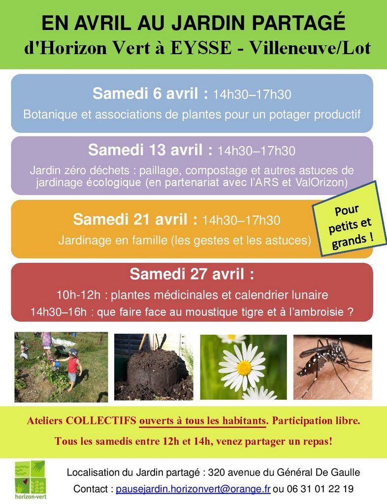 L’association Horizon Vert, qui milite depuis 30 ans en faveur de l’écologie, en partenariat avec l’ARS et ValOrizon, organise un atelier sur le thème du jardin zéro déchet, le samedi 13 avril de 14h30 à 17h30. Cet atelier est gratuit et à destination du grand public.
