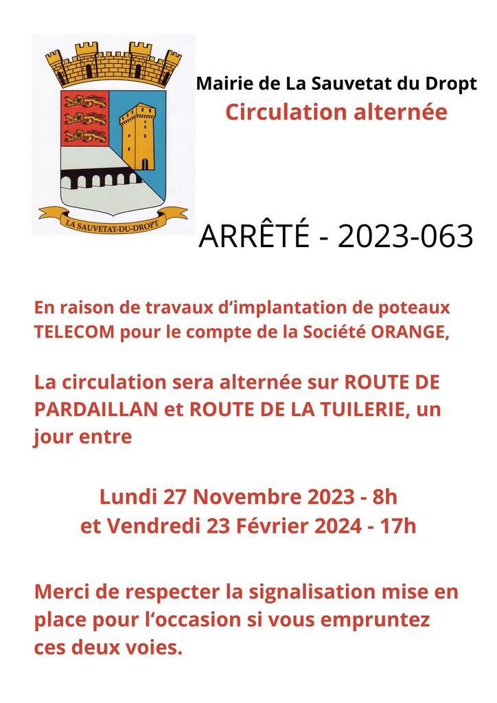 - Info Mairie : Arrêté de circulation pour implantation poteau téléphonique