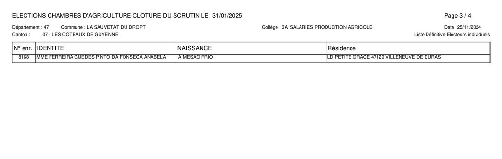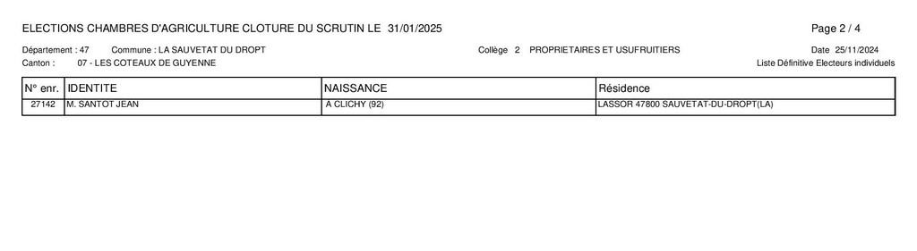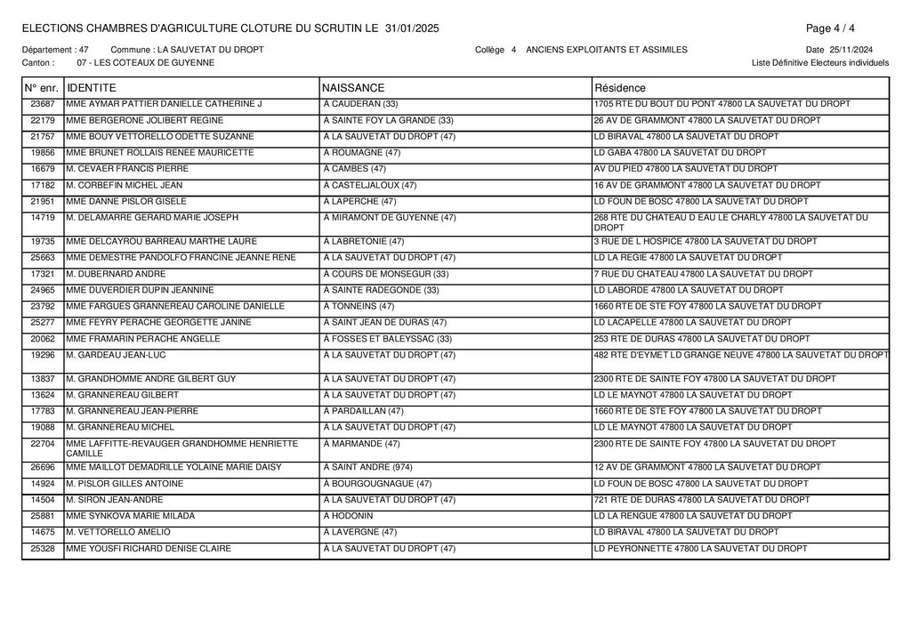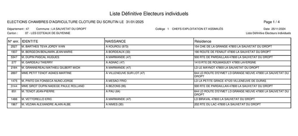Voici les listes définitives des électeurs individuels du canton Les Coteaux de Guyenne des 4 collèges pour les élections de la Chambre d’Agriculture du Lot-et-Garonne de janvier 2025.